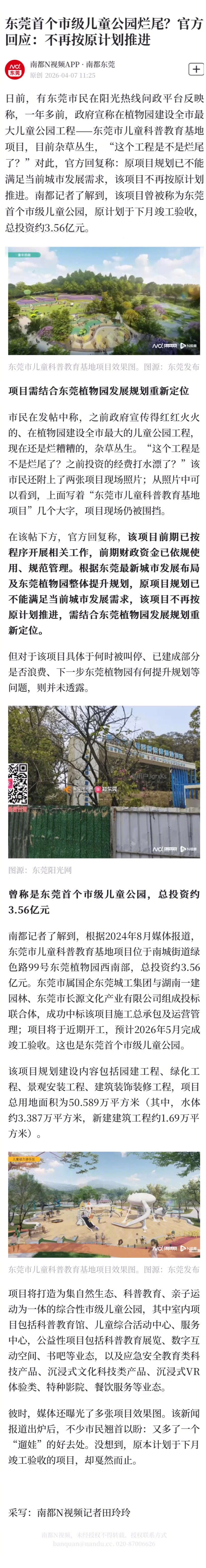 #东莞官方回应儿童公园烂尾质疑#【东莞首个市级儿童公园烂尾?官方回应:不再按原计划推进】#东莞3.56亿儿童公园项目叫停#日前,有东莞市民在阳光热线问政平台反映称,一年多前,政府宣称在植物园建设全市最大儿童公园工程——东莞市儿童科普教育基地项目,目前杂草丛生,“这个工程是不是烂尾了?”对此,官方回复称:原项目规划已不能满足当前城市发展需求,该项目不再按原计划推进。南都记者了解到,该项目曾被称为东莞首个市级儿童公园,原计划于下月竣工验收,总投资约3.56亿元。南都N视频记者田玲玲