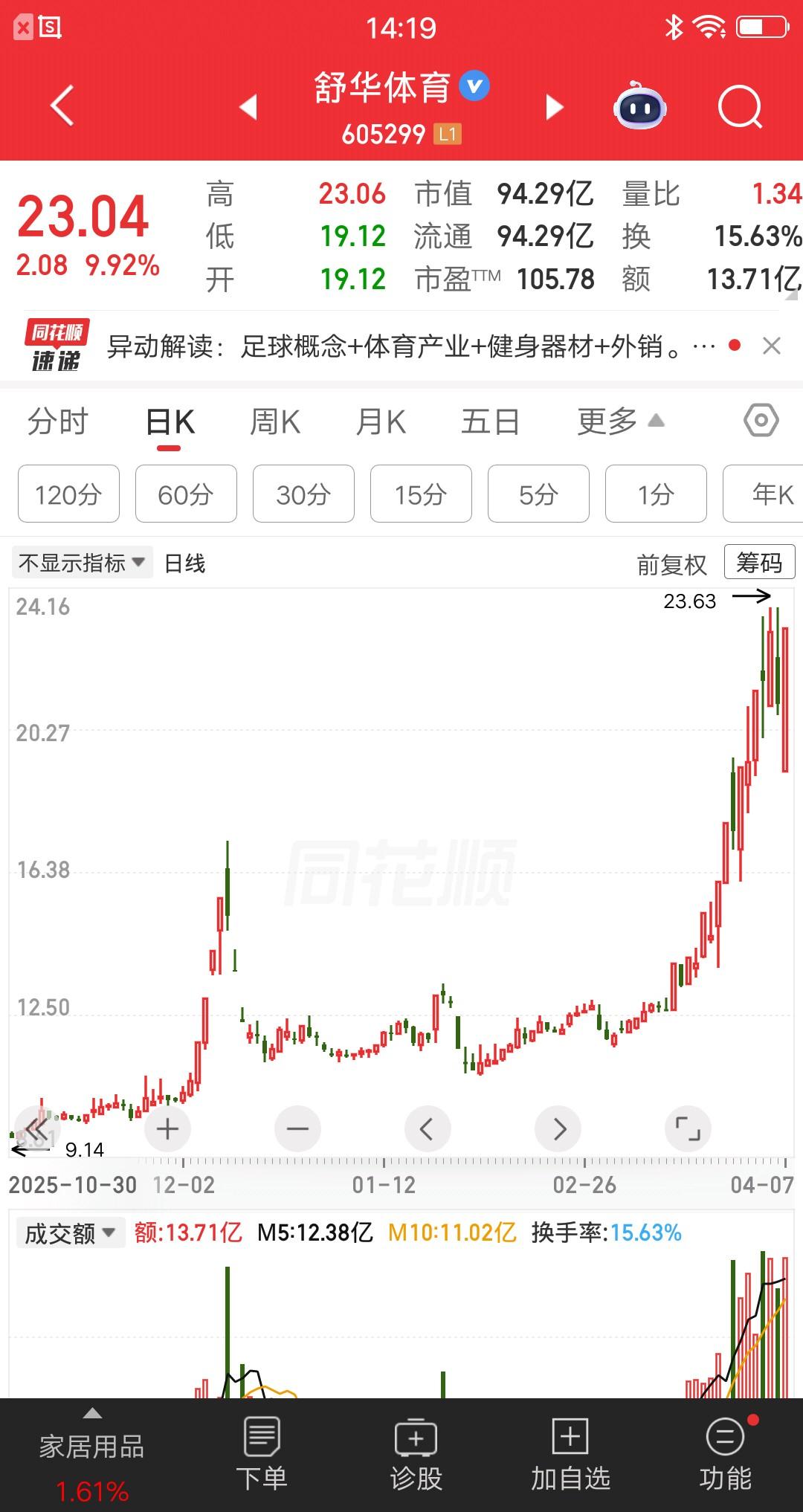 大A今天最牛的票诞生了,时隔多日地天板战法王者归来再度封神,简直屌爆了。 该票集合竞价大幅低开8.78%,竞价成交额6000万。从量能和跌幅看,资金出逃意愿很强呀。本以为开盘后会直线跌停,谁也没想到走势完全相反。股价直线拉升,第一波只是将跌幅收窄,缓解了恐慌情绪。第二波拉升翻红,股价在零轴附近反复震荡。第三波拉升,主力使出了吃奶的劲,一把干到涨停了。几乎是地天板走势了,厉害了。 竞价就跑的人后悔的拍大腿,少赚了近20个点,这可是大肉呀。竞价就买的资金,运气爆棚开心坏了,当天就吃大肉,真让人羡慕呀! 该票属于家居用品板块,炒作的是足球概念+体育产业+健身器材+外销。 大家要注意,热门股波动很大,风险也很大,咱们看看热闹就行了,切勿盲目追涨。