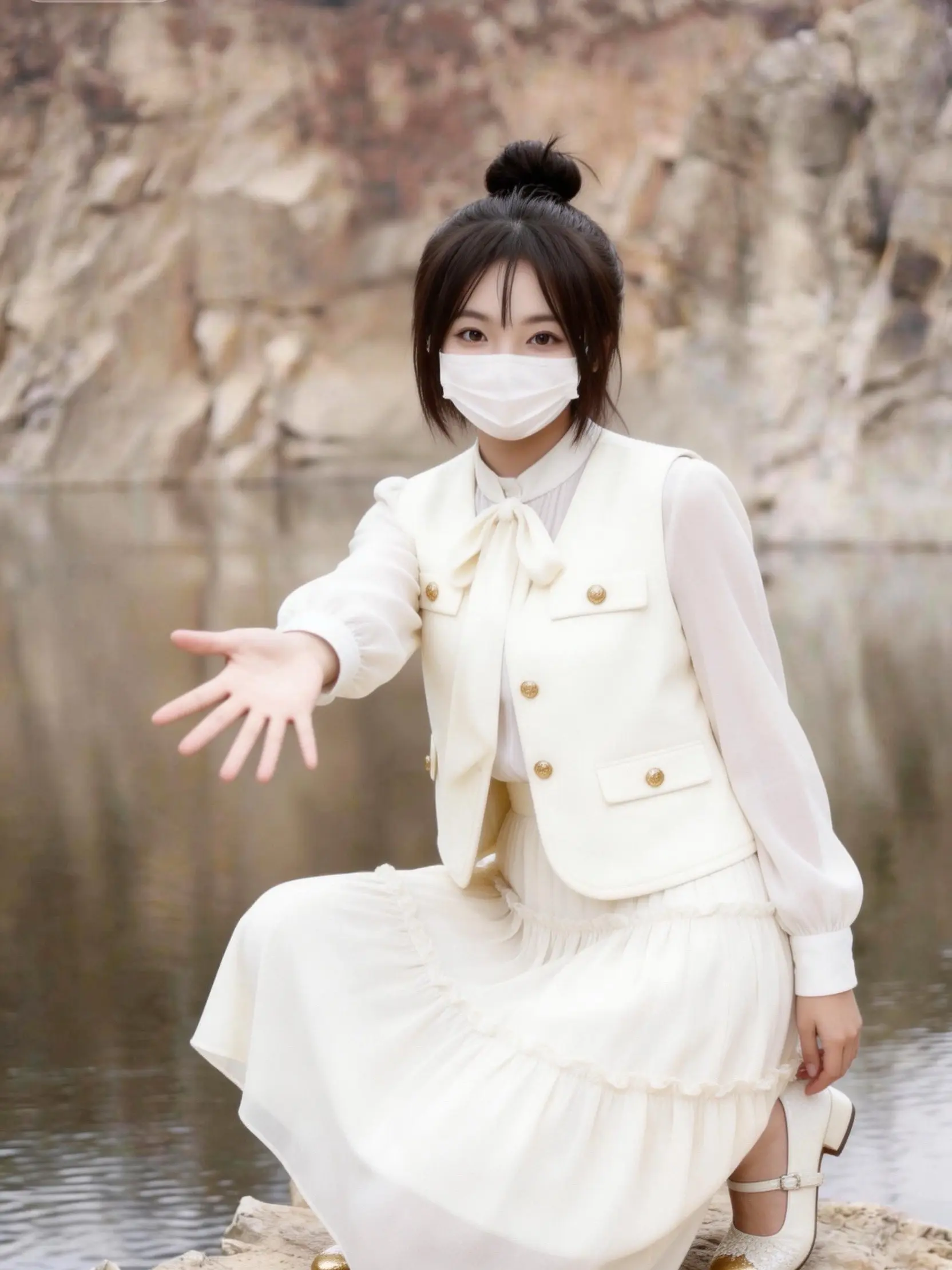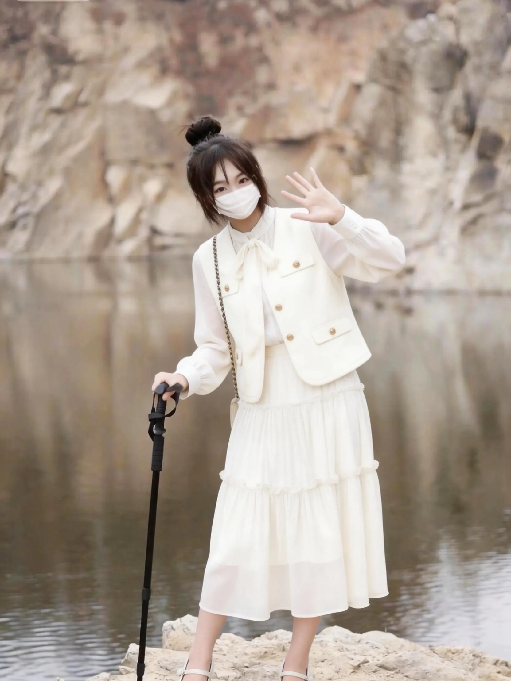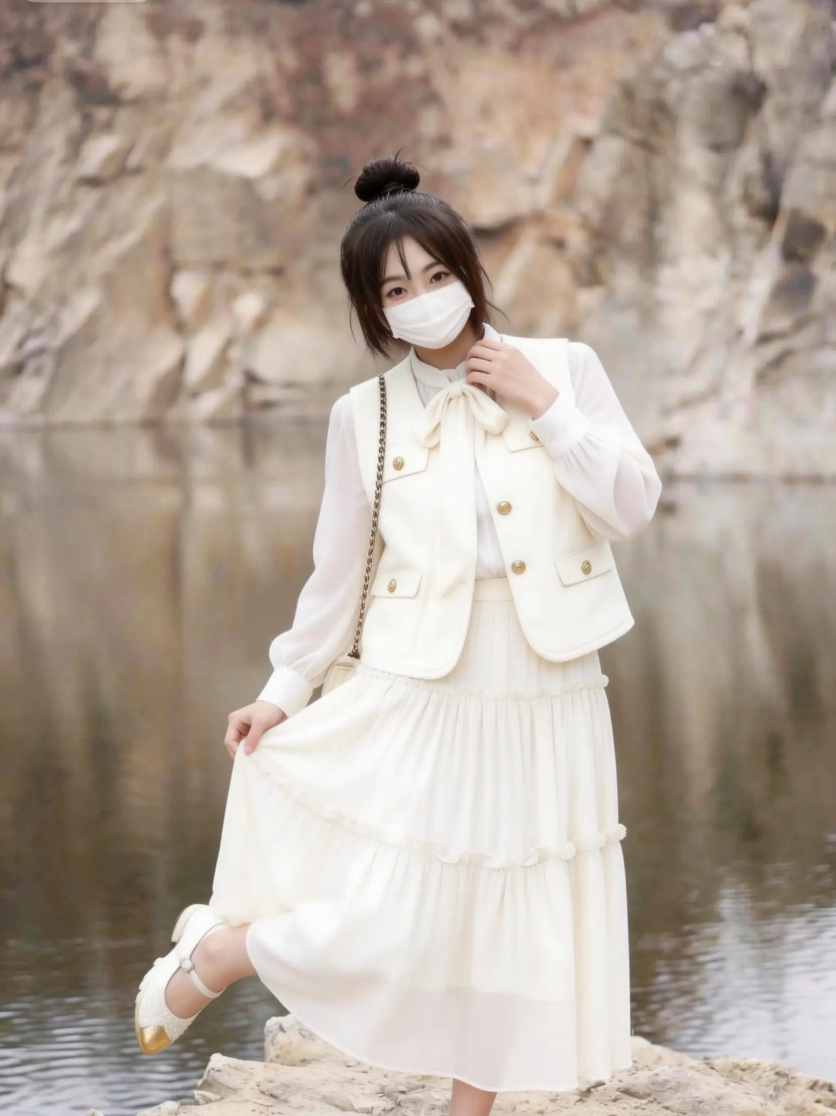 雪纺蝴蝶结衬衫+双排扣马甲,叠穿层次感拉满,搭配层层蛋糕裙,温柔又显瘦,奶fufu的颜色和户外场景绝配!