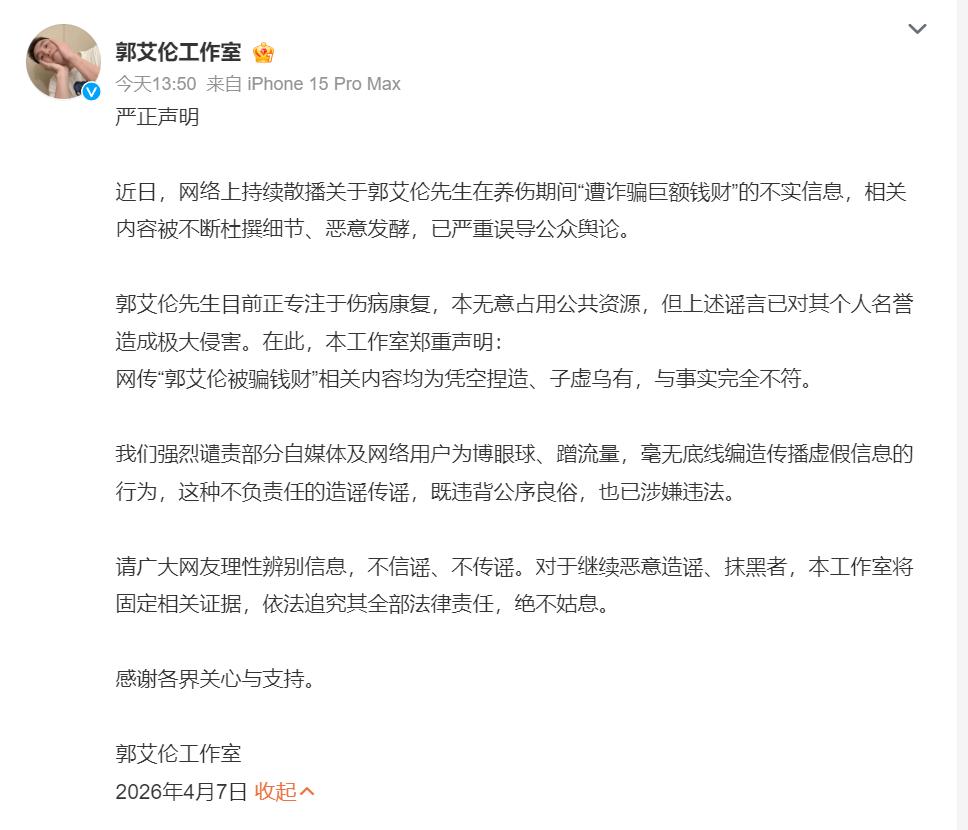 郭艾伦彻底怒了!发文硬刚否认被骗近千万”传闻,直言造谣者无底线,放话要追究最先传播媒体的责任