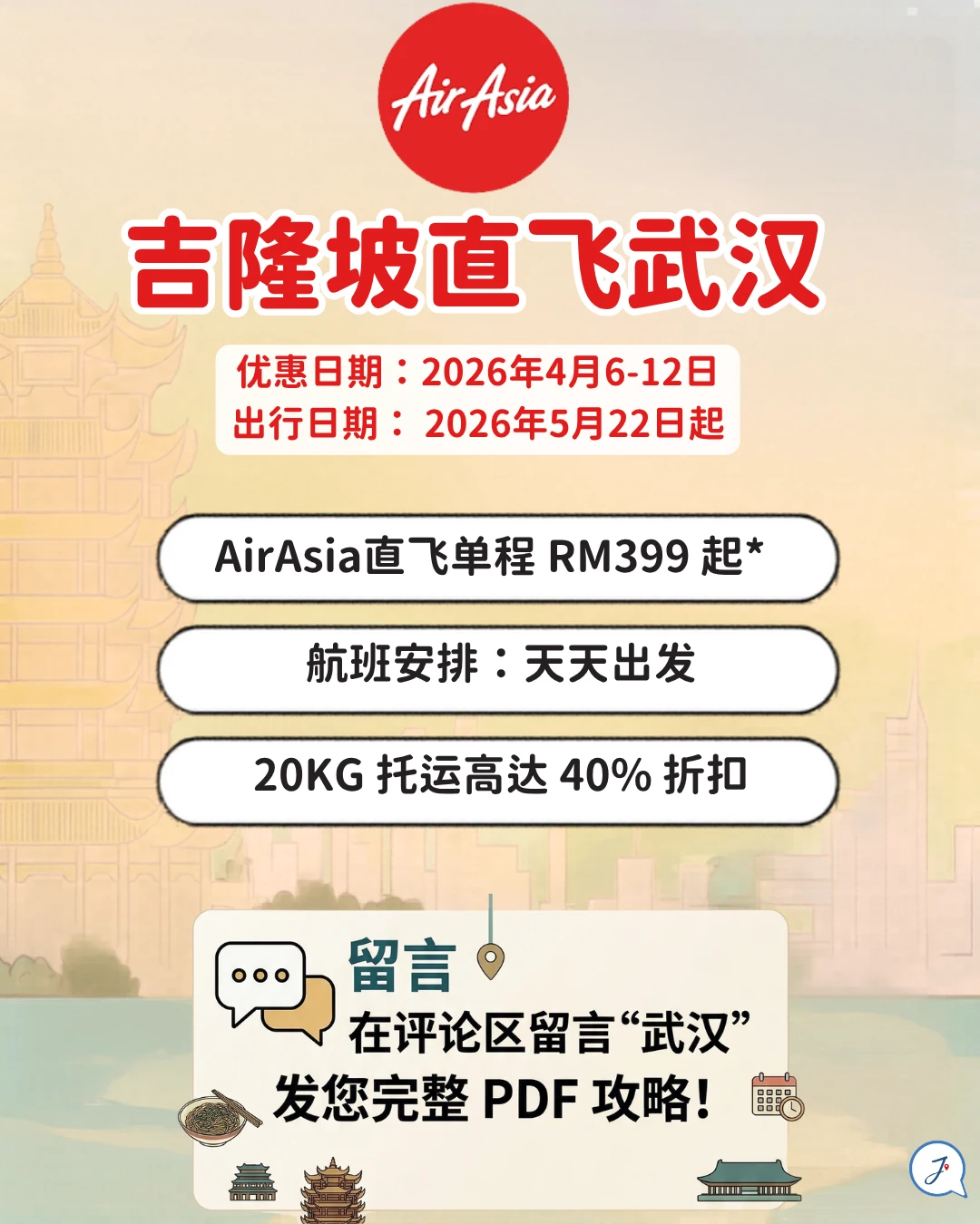 ‼️AirAsia有新航线,可以直飞武汉了,而且每天都有航班😍
