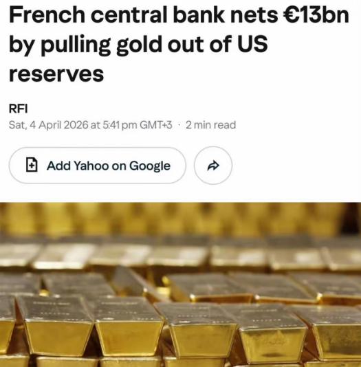法国央行抛售所有存放在美国的黄金 近日,法国央行出售了129吨存放在美国的黄金,获利130亿欧元,并表示,目前所有法国央行拥有的黄金均已存放在法国国内,未来也不会将黄金存放在国外了。 可能有人觉得这操作有点极端,其实一点都不意外,换谁也不愿意把自家的家底,天天放在别人家里看着,哪怕对方是多年的盟友。 黄金这东西,对一个国家来说是硬通货,是最靠谱的家底,相当于家里的应急钱,平时不用,但关键时刻能顶大事。 以前很多国家愿意把黄金存到美国,说白了就是二战之后,美国实力强,美元又硬,大家觉得放那安全,而且兑换美元也方便,尤其是冷战的时候,欧洲国家觉得把黄金放美国,比放自己家还稳妥,毕竟那时候欧洲局势不稳定。 但现在不一样了,时代变了,美国的行事风格越来越让人摸不着头脑,一会对这个加关税,一会对那个搞制裁,连自己的欧洲盟友都不放过,说加税就加税,一点情面都不留。 最关键的是,美国还总把美元当武器,谁不听话就冻结谁的资产,之前就冻结过俄罗斯近一半的黄金和外汇储备,这一下就让很多国家慌了神,心里都犯嘀咕:今天能冻结俄罗斯的,明天会不会就轮到自己?自家的黄金放在美国,万一哪天美国翻脸,想拿都拿不回来,那损失可就大了。 法国也不傻,肯定看在眼里记在心里,这次抛售所有存美黄金,说白了就是图个踏实。 而且人家这事做得特别聪明,不是简单地把黄金运回来,而是趁着金价高峰的时候,把存在美国的那些旧制式、纯度没那么高的黄金卖掉,等金价回调的时候,再从欧洲市场买符合自己标准的新黄金,存到巴黎的地下金库里。 这样一来,既没减少自家的黄金储备,还赚了130亿欧元,把之前央行的亏损都补上了,顺便还把所有黄金都收回了本土,一举三得,不得不说这波操作确实高明。 其实不止法国,很多欧洲国家早就开始琢磨着把黄金从美国运回来了,最典型的就是德国。 德国是全球黄金储备第二多的国家,之前有1200多吨黄金存在美国,占它总黄金储备的三分之一还多。 这些年德国一直在呼吁把黄金运回国,从2013年就开始逐步撤回,到2017年底就已经运回了600多吨,其中300吨就是从美国运回来的。 德国的议员们早就说了,现在美国的政策太不稳定,谁也不敢保证黄金放在那安全,必须亲自清点清楚,赶紧往回搬。 法国这波操作,其实就是跟着德国的脚步走,只不过比德国更干脆,直接一次性全卖了,不留一点余地。 另外,法国这次把所有黄金都撤回本土,还有一个原因,就是想降低对美国的金融依赖。 这些年,美国的债务越来越多,经济也时好时坏,货币政策忽松忽紧,美元的购买力也在下降,把黄金放在美国,不仅可能面临安全风险,还可能因为美元贬值而受损。 相反,把黄金放在自己国内,想怎么管理就怎么管理,遇到紧急情况,能立刻拿出来用,不用看别人的脸色,也不用担心被人卡脖子。 而且现在全球都在搞去美元化,越来越多的国家开始用本币结算,减少对美元的依赖,黄金的重要性就更凸显了。 法国作为欧元区的核心国家,自然要带头调整自己的资产配置,减少对美元资产的依赖,增加黄金这种硬通货的储备,并且把黄金放在自己国内,这样才能在复杂的国际环境中掌握主动权。毕竟,在这个动荡的时代,只有把自家的家底守好,才能立于不败之地。 再说了,法国这次赚的130亿欧元也不是小数目,刚好能弥补央行之前的亏损,还能改善央行的财务状况,这笔买卖怎么看都不亏。 人家说了,未来也不会再把黄金存放在国外了,这意思就是,以后不管遇到什么情况,都要把自家的黄金握在自己手里,再也不冒那种被人卡脖子的风险。 这种想法其实很实在,换做任何一个国家,估计都会这么做,毕竟谁也不想把自家的宝贝疙瘩放在别人家里,夜长梦多。 总之,法国央行抛售所有存放在美国的黄金,不是一时冲动,而是经过深思熟虑的战略选择,既保障了黄金储备的安全,又赚取了可观的收益,还顺应了全球金融发展的趋势,一举多得,未来也不会再将黄金存放在国外,就是要把自家的家底牢牢握在自己手里。