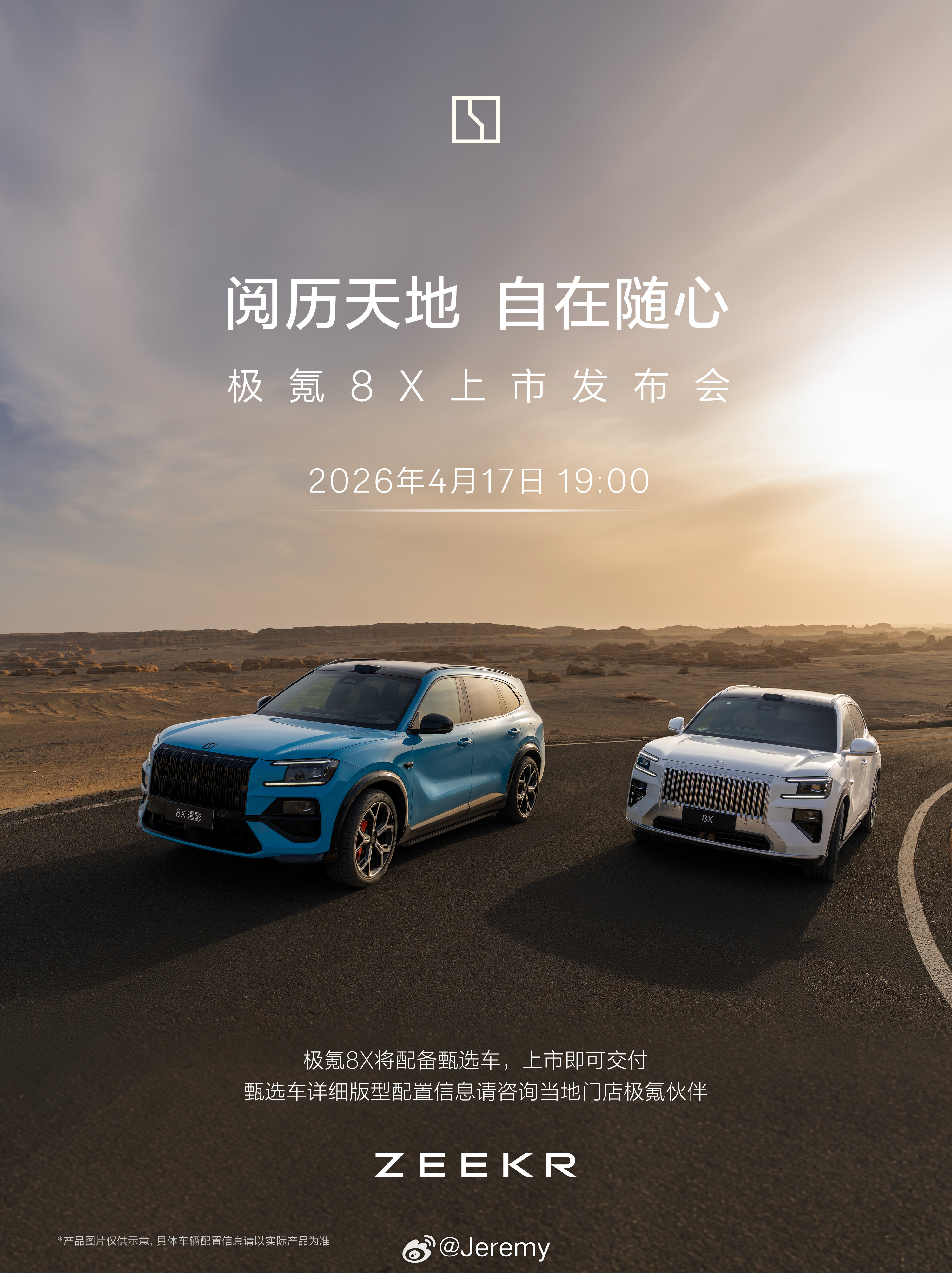 字小事大!极氪8X官宣4月17日正式上市,上市即可交付,想要在发布会以后马上提车的朋友注意关注“甄选车”的相关消息。