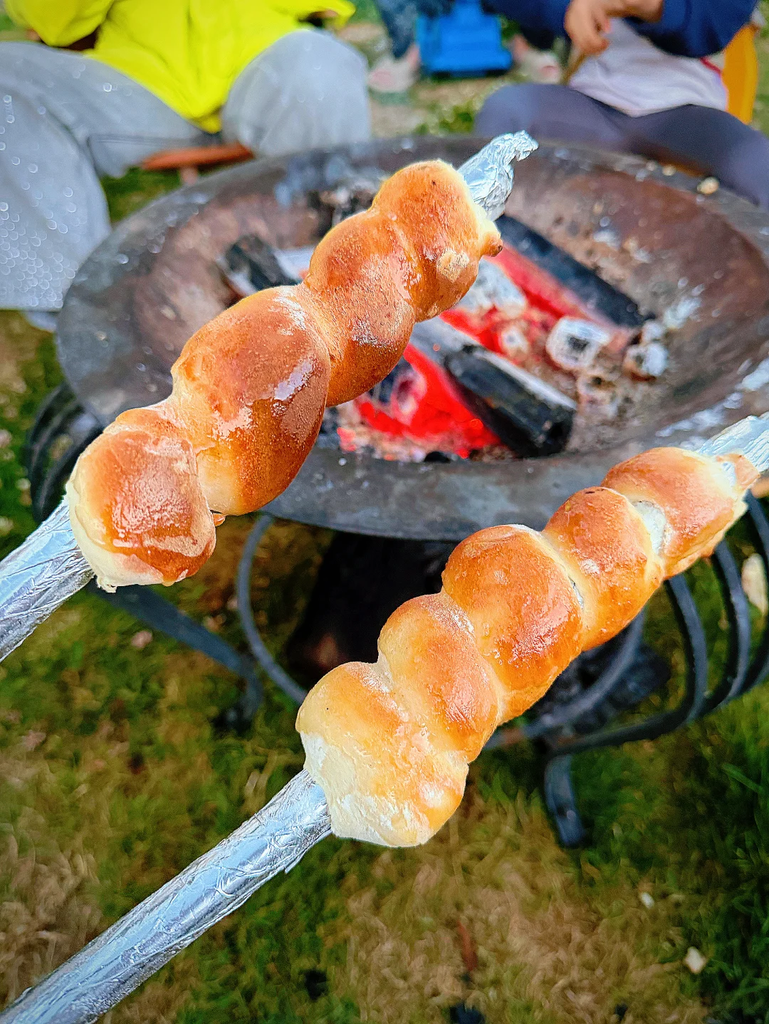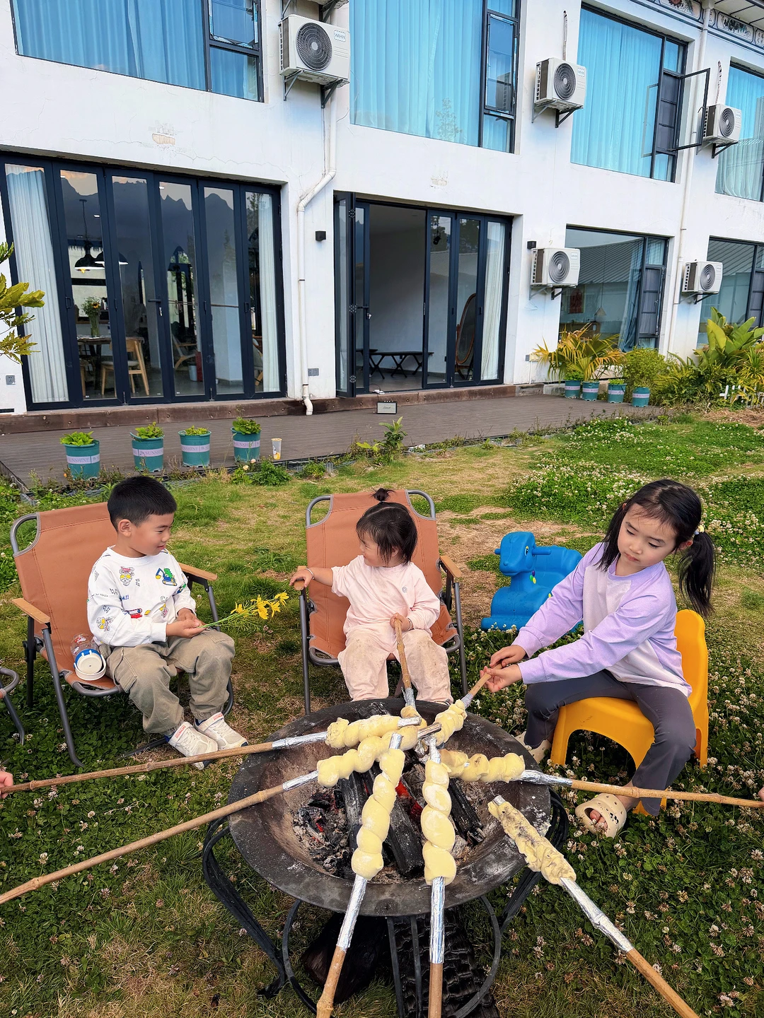 小朋友们举着烤串叽叽喳喳,大人们笑着拍照聊天