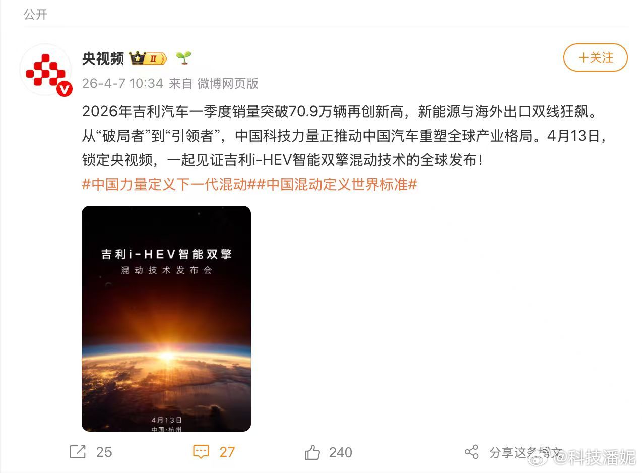 再看销量数据,2026年吉利一季度销量突破70.9万辆,创下新高,新能源车型和海外出口都保持着强劲增长。有销量打底,再加上核心技术发力,中国混动确实在一步步展现属于自己的实力。中国力量定义下一代混动智驾数码团