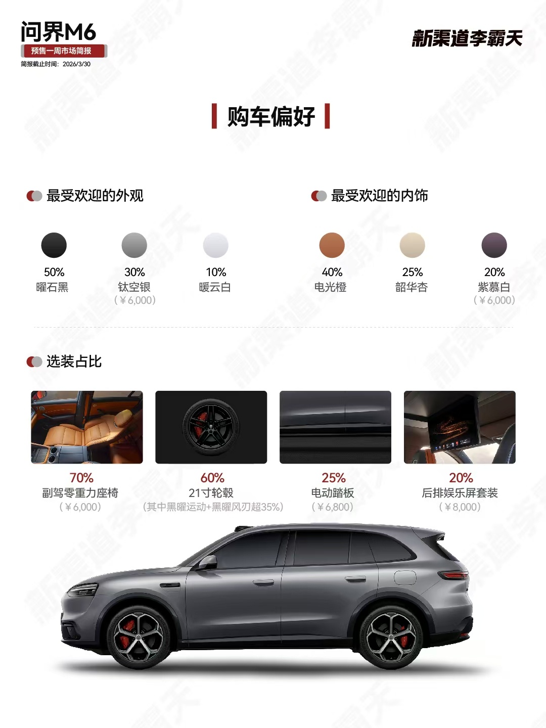 近日,有博主调研问界M6预售一周市场表现。整体看,问界M6平均单店小订60-80辆,其中问界M6小订纯电版订单近五成。用户画像方面,问界M6近七成小订用户为90后,女性用户占比超35%,单身和年轻无孩家庭占比超60%,数据证明此次问界M6用户低龄化趋势明显,成功切入年轻市场。