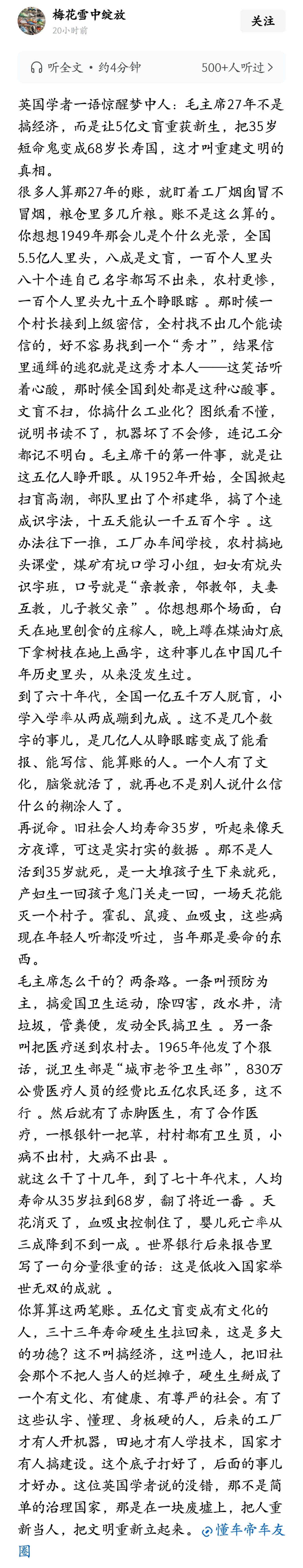毛主席27年不是搞经济,而是让5亿文盲重获新生,把35岁短命鬼变成68岁长寿国,这才叫重建文明的真相。