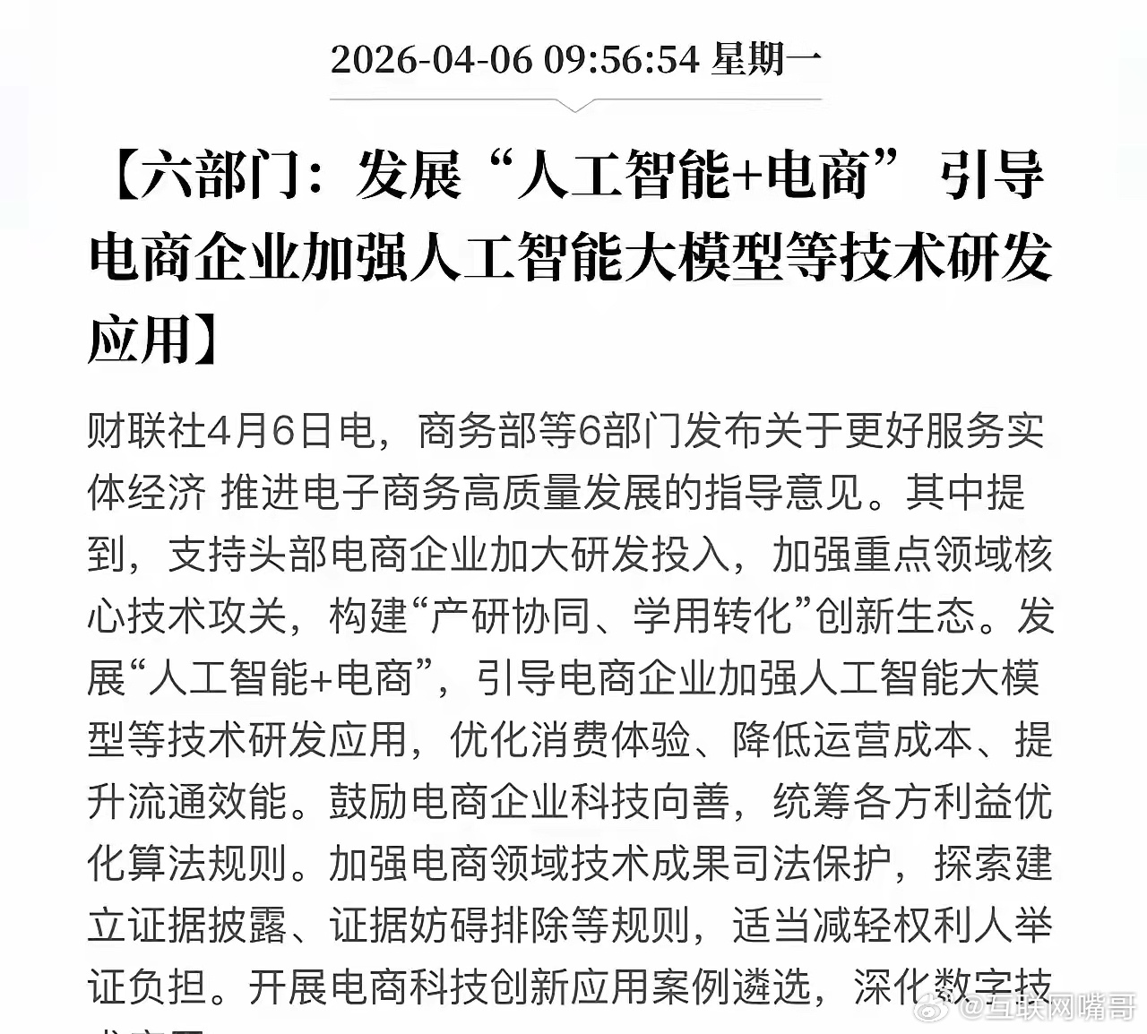电商大地震!六部门联手出击,AI大模型将全面接管电商!4月6日,商务部等6部门联合发文,明确指出:大力发展“人工智能+电商”!电商行业——正迎来前所未有的AI变革。核心要点,国家支持——力挺头部电商加大AI研发投入,攻关核心技术;AI大模型应用——优化消费体验、降低商家成本、提升物流效率。从个性化推荐到智能供应链,从AI生成营销内容到自动化仓储,AI正在重塑电商的每一个环节。政策明确支持“产研协同、学用转化”,意味着AI技术将更快落地,惠及消费者与商家。你的购物体验将彻底改变!以后逛电商,可能不再是“刷”商品,而是和AI对话:“帮我搭配一套约会穿搭”“推荐适合油皮的防晒霜”……AI直接给你配齐,一键下单。商家端更疯狂,AI客服24小时在线,AI生成爆款文案,AI预测下一个热卖品……成本直降,效率翻倍。国家已按下加速键,电商行业即将进入智能淘汰赛!AI+电商,不再是锦上添花,而是生死时速。