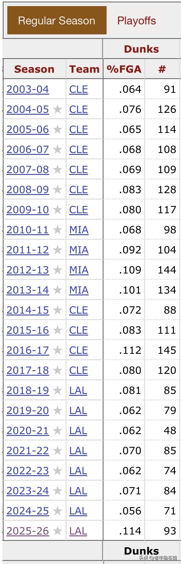 老詹里程碑!本赛季扣篮数超新秀赛季,生涯巅峰数据曝光 4月7日消息,昨日NBA常规赛,湖人以128-134不敌独行侠。 湖人球星勒布朗·詹姆斯本场出战38分钟,全场22投12中,三分6中1,罚球9中5,贡献30分9篮板15助攻1抢断。 美媒Crazy Stats晒出数据,詹姆斯本赛季已完成93次扣篮,成功超越其新秀赛季的91次,创下生涯新高度。 其生涯单赛季扣篮巅峰为:2016-17赛季骑士时期145次、2012-13赛季热火时期144次。