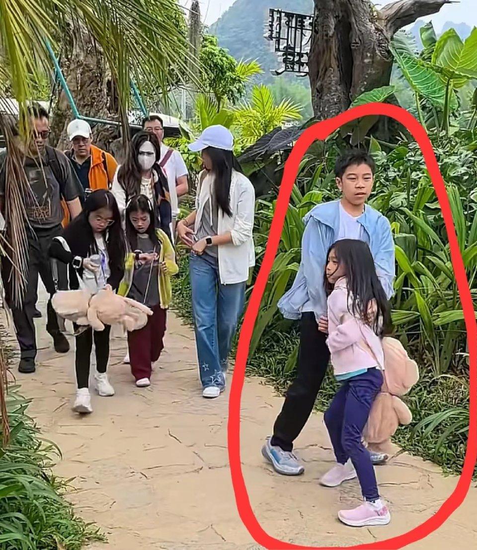 霍启刚带仨娃在广西崇左逛景区的照片,被游客拍了个正着——没保镖没助理,三个孩子背