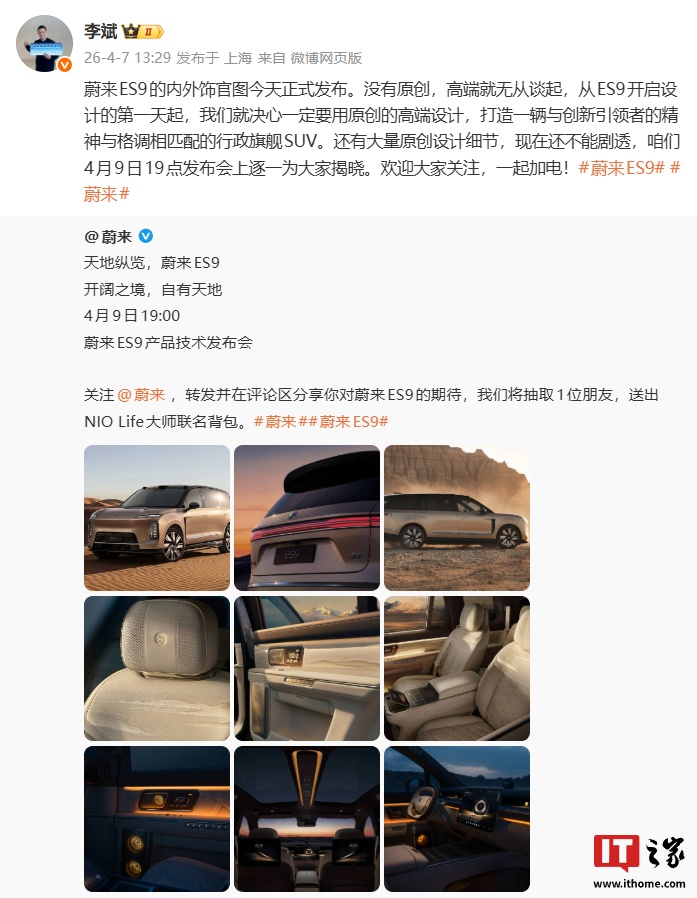 IT之家4月7日消息,蔚来官方今日公开了ES9旗舰SUV的外观及内饰情况,新车技术发布会将在4月9日举行。