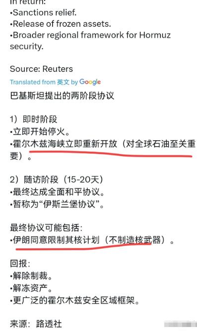 美伊进行谈判了!双方谈判条件曝光!4月6日,根据外媒报道,在巴基斯坦的斡旋下,美国与伊朗进行了接触。巴基斯坦提出的两阶段协议,第一阶段,美国的条件是,停火立即开始,霍尔木兹海峡立即重新开放(全球石油的关键)。第二阶段是,未来15-20天,最终达成全面和平协议。包括:伊朗同意限制核计划(无武器)。 说白了,这哪是什么平等谈判啊,分明就是巴基斯坦在中间拉架,美国趁机提条件,伊朗一边硬扛一边权衡的大型博弈现场,闹了这么久,终于有了点缓和的苗头,但里面的门道可太多了。 4月6号,外媒一曝光美伊接触的消息,全网都炸了,谁也没想到,最后出来斡旋的会是巴基斯坦。 据说巴基斯坦陆军参谋长连夜和美国副总统、伊朗外长沟通,才拿出了这个两阶段协议,说白了就是先止血再谈长远。 美国的心思太直白了,第一阶段就要求立即停火,还要霍尔木兹海峡马上重新开放,要知道这可是全球石油的命门啊,据说每天有近2000万桶石油从这里过,占全球海运石油贸易的四分之一,美国急着让它开放,其实就是怕能源价格再涨,影响自己的利益。 网上有句话我看着就来气,有人说“伊朗现在终于明白,当初贸然发动战争,确实是一个错误的决定”,我真想反问一句,到底是谁终于明白?是谁贸然发动战争?是谁作出了错误决定?难道不是美国吗? 从冲突开始,一直是美国在中东煽风点火、极限施压,伊朗不过是被迫反击,怎么到最后反而成了伊朗的错?这话说得也太不公平了。 不过说真的,通过这次冲突,是真的不能小看伊朗,我感觉伊朗人口差不多快1亿了,这么大的人口基数,能扛住美以的大规模轰炸和打击,还能精准反击,真的不容易。 据说伊朗现在还有1000枚左右的弹道导弹,之前多次突破以色列的防空系统,击中海法、特拉维夫等城市,造成不小的破坏,就这份实力,在中东绝对算得上硬骨头,不是随便就能被拿捏的。 但话说回来,伊朗再硬气,恐怕也扛不住长期消耗,我觉得再打两个月,后果真的不敢想,伊朗本身粮食就有不少依赖进口,一旦进口渠道被切断,说不定真的会有几百万人面临粮食危机,到时候所有工业被摧毁,伊朗被逼到绝境,说不定真的会破釜沉舟,把整个中东搅乱。 而最扛不住的其实是全世界,霍尔木兹海峡一旦长期封锁,全球油价会继续飙升,化肥生产受阻,粮食价格也会跟着涨,据说要是冲突持续到6月,全世界会多4500万人陷入粮食不安全的境地。 反观美国,人家自产石油,或许根本不慌,其实就是把全世界拖下水,自己坐收渔利。 现在巴基斯坦提出的两阶段协议,看似是缓和局势的希望,但其实难度不小。 据说伊朗已经明确表示,不会为了临时停火就开放霍尔木兹海峡,也不接受美国的最后通牒,毕竟吃过美国反悔的亏,肯定要留一手,美国则急着先稳住能源通道,再谈核计划的事,双方的核心诉求根本没那么容易调和。 最后说明一下,以上全是我个人看法,不代表任何立场,只是结合已知消息做的简单解读。美伊这次谈判能不能成,后续会不会有变数,谁也说不准,你们觉得伊朗应该答应美国的条件吗?欢迎在评论区留下你们的看法。