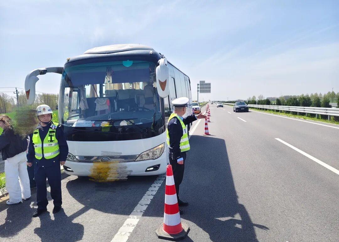 接到求助后,大队民警张卫献、辅警刘景琸迅速赶赴事发现场,同时联动路政和施救公司协同前往处置。到达现场后,民辅警迅速设置警示标志,划定防撞隔离区,并在客车后方200米处部署警力预警,构筑安全防护屏障。