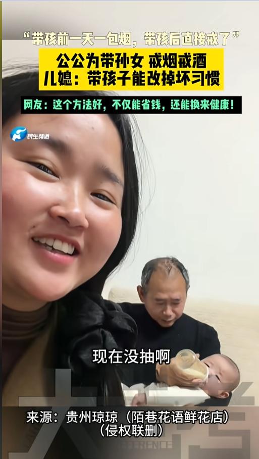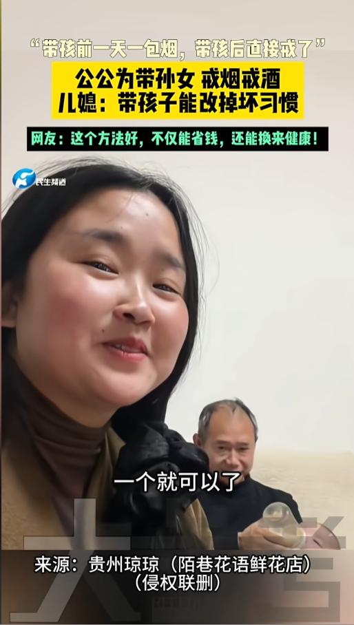 “别再说什么戒不了了!”近日,贵州,一位儿媳发视频调侃自己的公公,以前要一天一包烟,自从有了孙女后,他直接就不抽了,其他坏习惯也改了,就为了带孙女的时候,不影响到他孩子的健康。网友:真的爱才会为对方着想! 二手烟的危害比一手烟还大,最近的新闻里,就有好几个因为二手烟患癌的,其中有一个才16岁。罪魁祸首就是父亲丈夫抽烟不避人,一问就是戒不了。其实这都是借口,要是真的在乎,早就戒了。 据媒体4月7日报道,这位公公以前可是个老烟枪,一天得一包烟。可自从儿媳妇生了孩子以后,为了带孙女,他是烟也不抽了,酒也不喝了,其他的坏习惯也都改了,直接跟换了个人一样。 儿媳调侃公公,看来带孩子能改掉他不少坏习惯。公公也不反驳,就说自己喜欢带孩子。看得出来,在他眼里,孩子比什么都重要,为了孩子,戒掉这些臭毛病根本就不叫个事儿。 儿媳妇又笑着说,既然你这么喜欢,那以后再多生几个给你看。公公听了直摇头,赶忙说,“一个就行,一个就行”。 网友看后,都被这俩人的对话逗乐了,纷纷表示,这才是一个健康的家庭氛围啊,这才是一个爷爷最实在的爱!什么戒不掉,那都是找到借口,只是在那些人眼里,眼前人不如那点烟酒重要罢了! 信息来源:《“带孩前一天一包烟,带孩后直接戒了”公公为带孙女 戒烟戒酒儿媳:带孩子能改掉坏习惯,网友:这个方法好,不仅能省钱,还能换来健康!》大参考