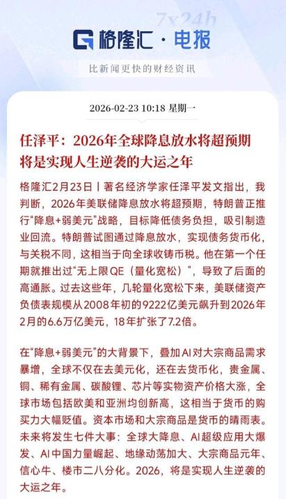 经济学家认为:2026 年将会是资本市场大放水的一年,普通人要实现逆袭就要把钱换成资产,因为大放水后,钱会变得不值钱,而资产会变得更加有价值。 从 2026 年年初到 4 月初,央行已经多次明确释放信号,将继续实施适度宽松的货币政策,灵活运用降准降息等工具保持市场流动性充裕,目的就是为经济稳定增长、物价合理回升创造合适的金融环境,这一系列操作,本质上就是为市场注入更多资金,也就是大家常说的放水。 过去几十年里,但凡遇到大规模货币宽松周期,手里握现金的人永远是最吃亏的,这个规律在 2026 年同样不会失效。 你手里的现金本身不会凭空消失,但它的购买力会在不知不觉中被稀释,就像一杯不断加水的糖水,糖的分量没变,味道却越来越淡。 很多人习惯把工资、积蓄全部存在银行里,觉得安全又省心,可在宽松周期里,银行存款利率持续走低,哪怕是定期存款,利息也跑不赢实际的购买力缩水速度,看似稳稳当当的存款,其实在悄悄贬值,这就是普通人最容易忽略的隐形财富流失。 可能有人会问,为什么一定要在 2026 年放水,难道就不能一直保持紧缩吗?答案很简单,当前国内经济还面临供强需弱、外部市场波动等多重压力,需要充足的流动性来支撑实体经济复苏,扶持中小微企业、科技创新、新质生产力等重点领域发展,同时也要稳定市场预期,让经济重回稳步增长的轨道。 全球范围内,不少经济体也在同步调整货币政策,逐步转向宽松,在这样的大环境下,保持适度放水既是国内发展的需要,也是应对外部变化的必然选择,不是某个人、某个机构的临时决定,而是宏观层面的必然走向。 既然放水已成定局,普通人最该做的不是抱怨,而是赶紧把手里的现金换成能保值增值的资产,这不是投机,而是最基础的财富防御。 很多人觉得资产就是房子、股票,门槛高、风险大,自己根本玩不起,其实这种想法完全错了,资产的种类有很多,从低风险到中风险,总有适合普通人的选择,关键是别再把所有钱都攥在手里不动。 首先要明确一点,我们说的换资产,不是让你把全部身家砸进去,更不是盲目跟风追高,而是在留足家庭应急资金、保证基本生活开销的前提下,把闲置的现金转化为能跟着市场水涨船高的资产。 对于风险承受能力低的普通人,不用碰高波动的品种,黄金、高等级债券、固收 + 产品、储蓄国债都是很稳妥的选择。 2026 年以来,全球央行持续购金,贵金属本身就具备抗通胀、抗风险的属性,在货币宽松周期里,保值效果一直很稳定;储蓄国债和高等级债券收益稳定、安全性高,不用操心涨跌,适合用来做资产的安全垫。 这些资产不需要你有专业的投资知识,也不用天天盯盘,只要长期持有,就能稳稳跑赢现金贬值的速度,守住自己的财富不缩水。 如果能接受一点点波动,想追求更高一点的收益,也可以关注高分红的核心指数基金、新质生产力相关的赛道基金,还有符合政策导向的基建、消费类资产。 2026 年 A 股市场呈现明显的结构性行情,资金会流向有政策支持、有业绩支撑的领域,比起盲目买个股,买宽基指数或者主题基金,风险更分散,也更适合没有时间研究个股的普通人。 重点是要分批买入,不要一次性梭哈,避免买在短期高点,用时间换空间,才能在宽松周期里拿到属于自己的收益。 还有人会纠结,现在要不要买房,其实 2026 年的房地产市场已经不是普涨时代,核心城市、核心地段的优质房产依然有保值属性,但三四线城市的普通住宅已经不适合作为投资标的,普通人如果没有自住需求,没必要强行把钱砸进房产里,流动性差、变现难,反而会困住自己的资金。 我们说的资产配置,是灵活的、适配自己需求的,不是非要跟风买房买股,适合自己的才是最好的。 最可怕的不是放水,而是普通人在放水周期里依然抱着旧观念,死守着现金不做任何调整。 过去十几年里,每一次货币宽松都带来一次财富再分配,抓住机会把现金换资产的人,实现了财富逆袭,而一直握现金的人,只能看着财富慢慢缩水。 2026 年的宽松周期,不是富人的专属游戏,而是给普通人一次守住财富、甚至实现阶层跨越的机会,门槛没有大家想的那么高,关键是要转变思维,立刻行动。 不要觉得自己钱少就没必要配置,几百块、几千块都可以开始,积少成多,慢慢积累资产,总比眼睁睁看着现金贬值要强。 也不要被所谓的专业术语吓退,其实核心逻辑很简单,水涨船高,现金是浮在水面上的,会被冲走,而资产是沉在水里的船,会跟着水一起涨起来。 央行的宽松信号已经非常明确,市场的趋势也已经明朗,2026 年就是普通人改变财富状况的关键一年,别再犹豫,别再观望,赶紧把手里的闲钱换成合适的资产,守住自己的财富,抓住这波属于普通人的逆袭机会。