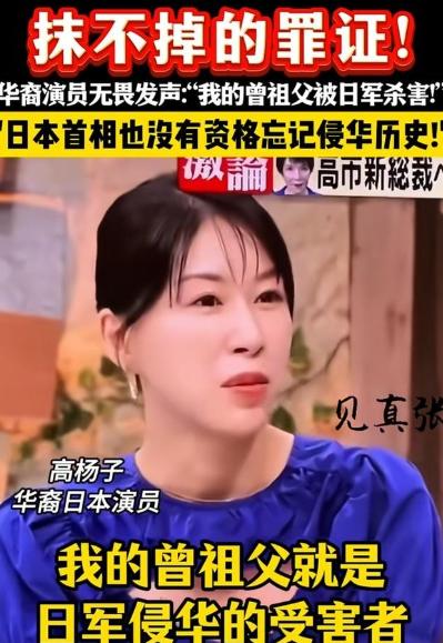 华裔日本演员高杨子,在日本电视台访谈节目中直言:我的祖父亲眼看到曽祖父被日本侵略者残忍杀害,没有一个中国人会忘记这段历史,日本首相也没有资格忘记侵华历史。