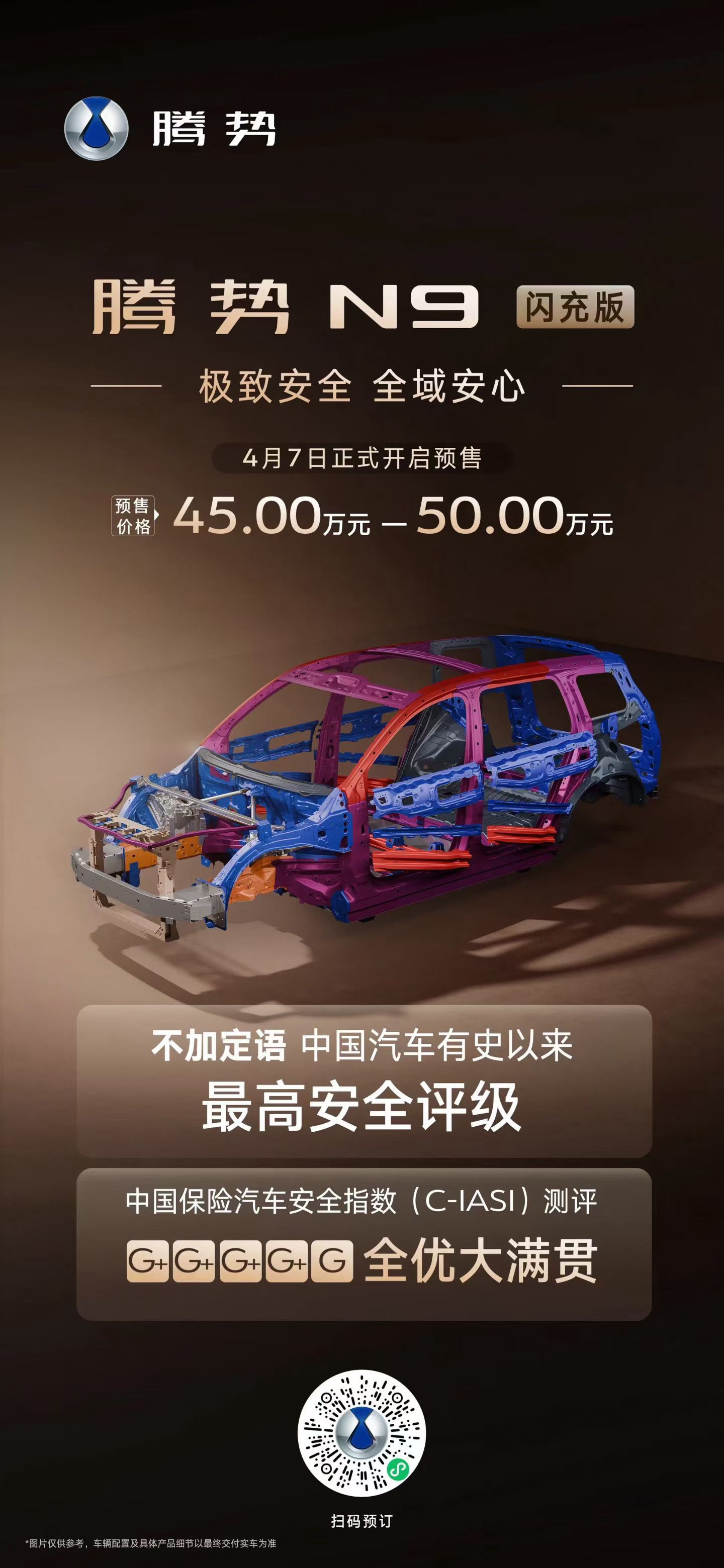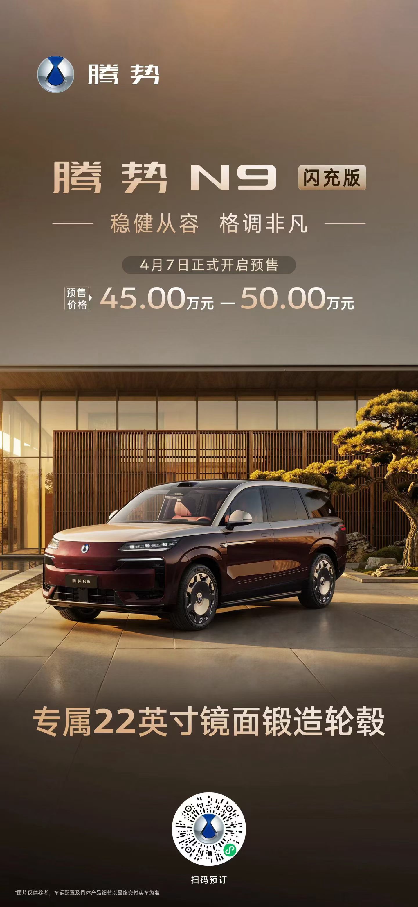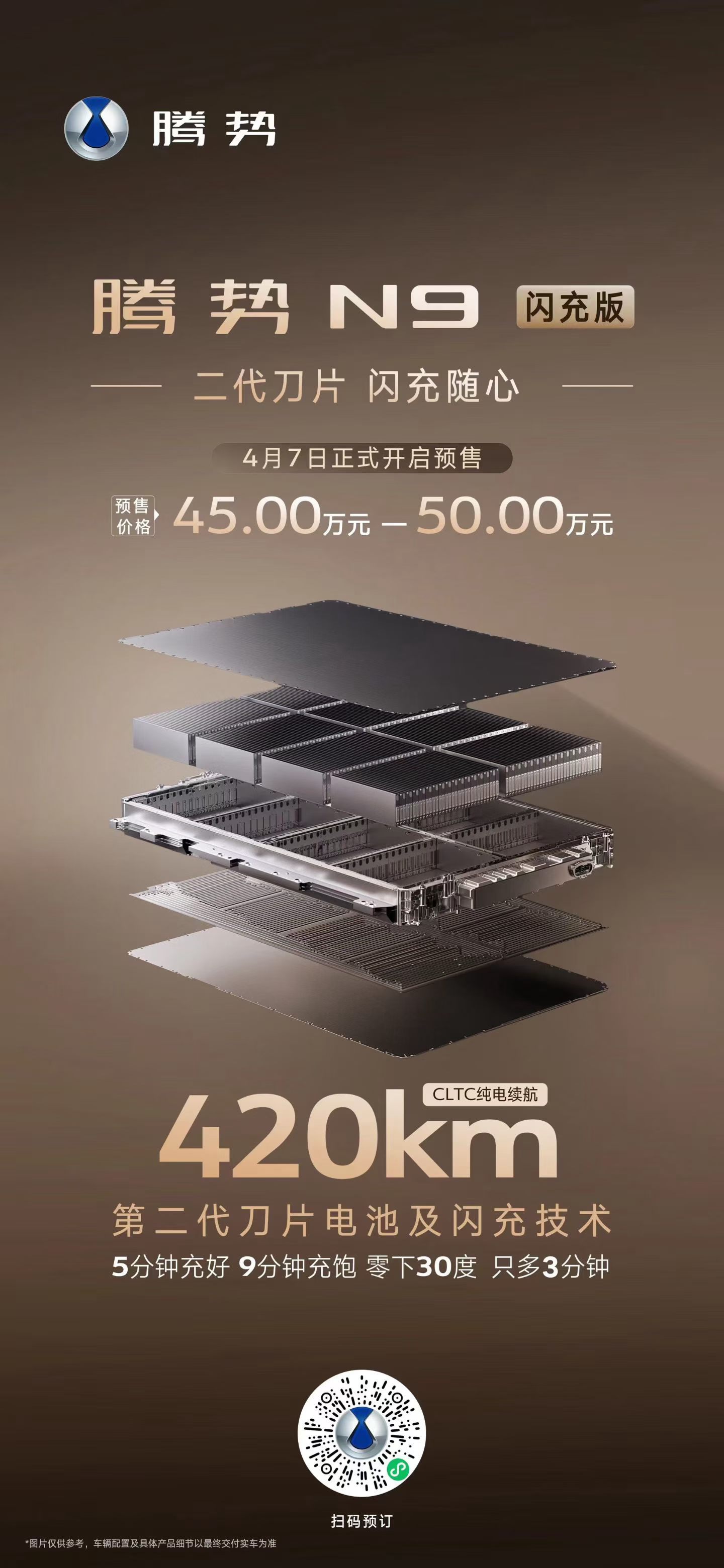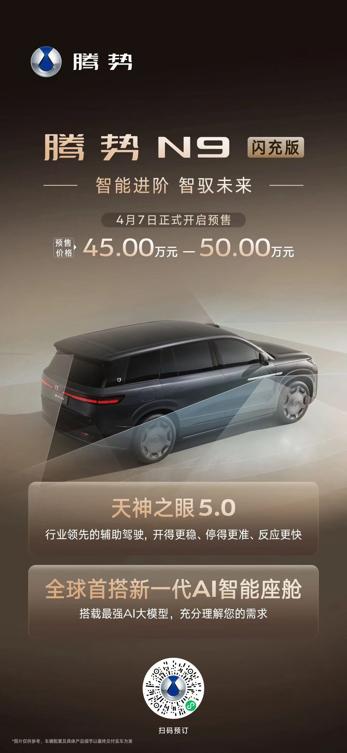 腾势N9闪充版 预售价45万-50万元!标配第二代刀片电池、纯电续航420km,标配天神之眼5.0、新一代AI智能座舱,还有易三方、云辇A等核心科技,共享18个月免费闪充权益!