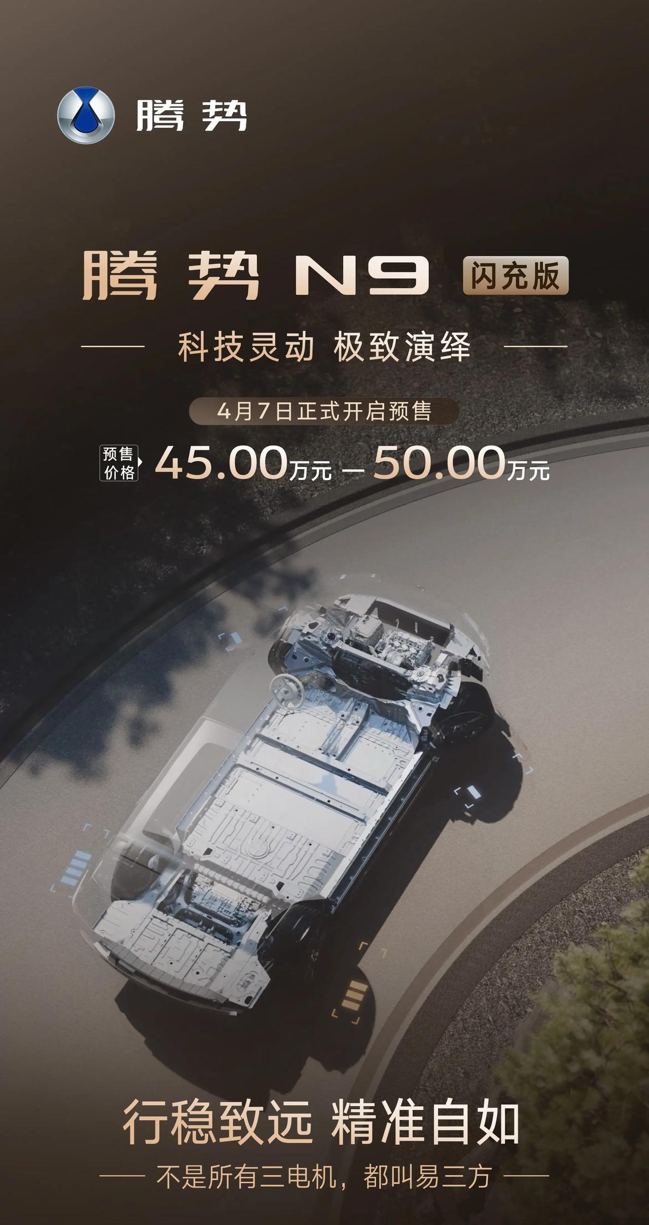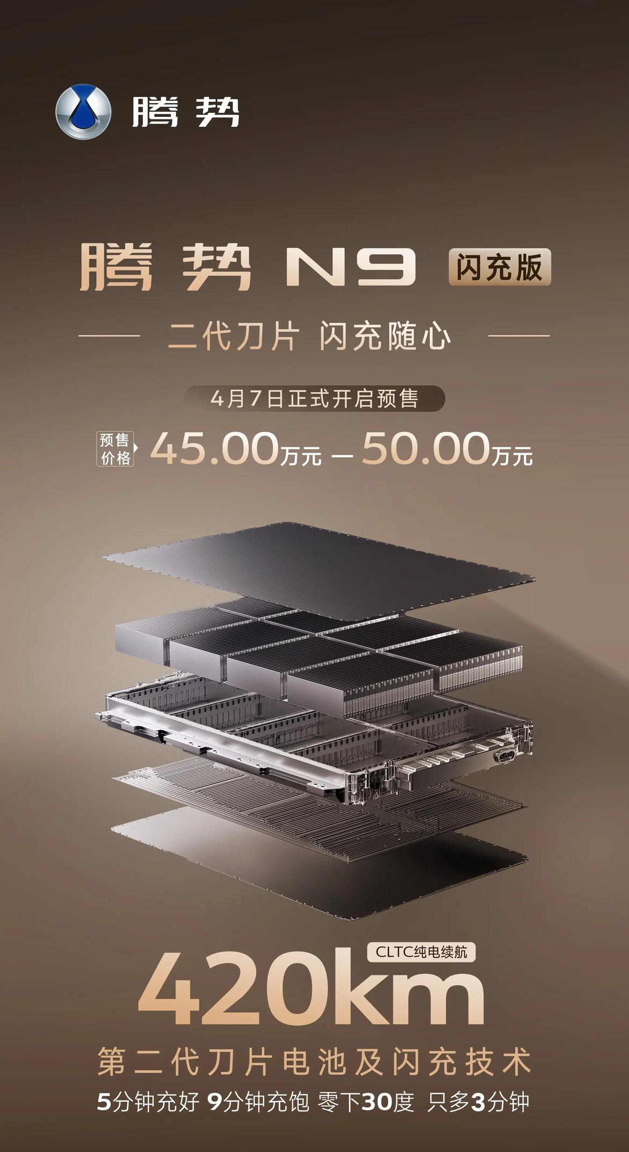 腾势N9闪充版4月7日开启预售,45-50万。参数炸裂:二代刀片电池、5分钟充70%、3.9秒破百、中保研全优……全网都在吹,但我劝你冷静3分钟。