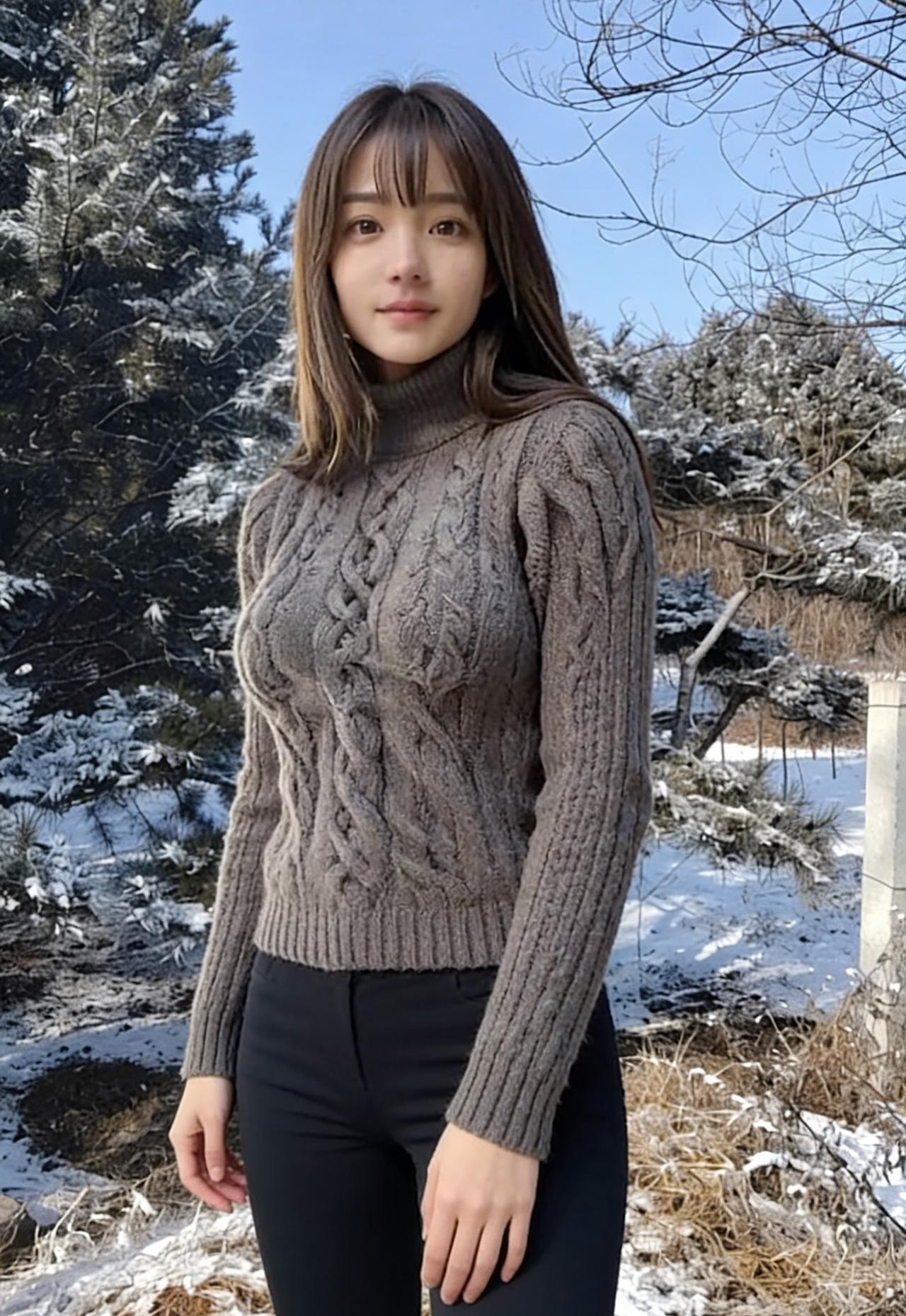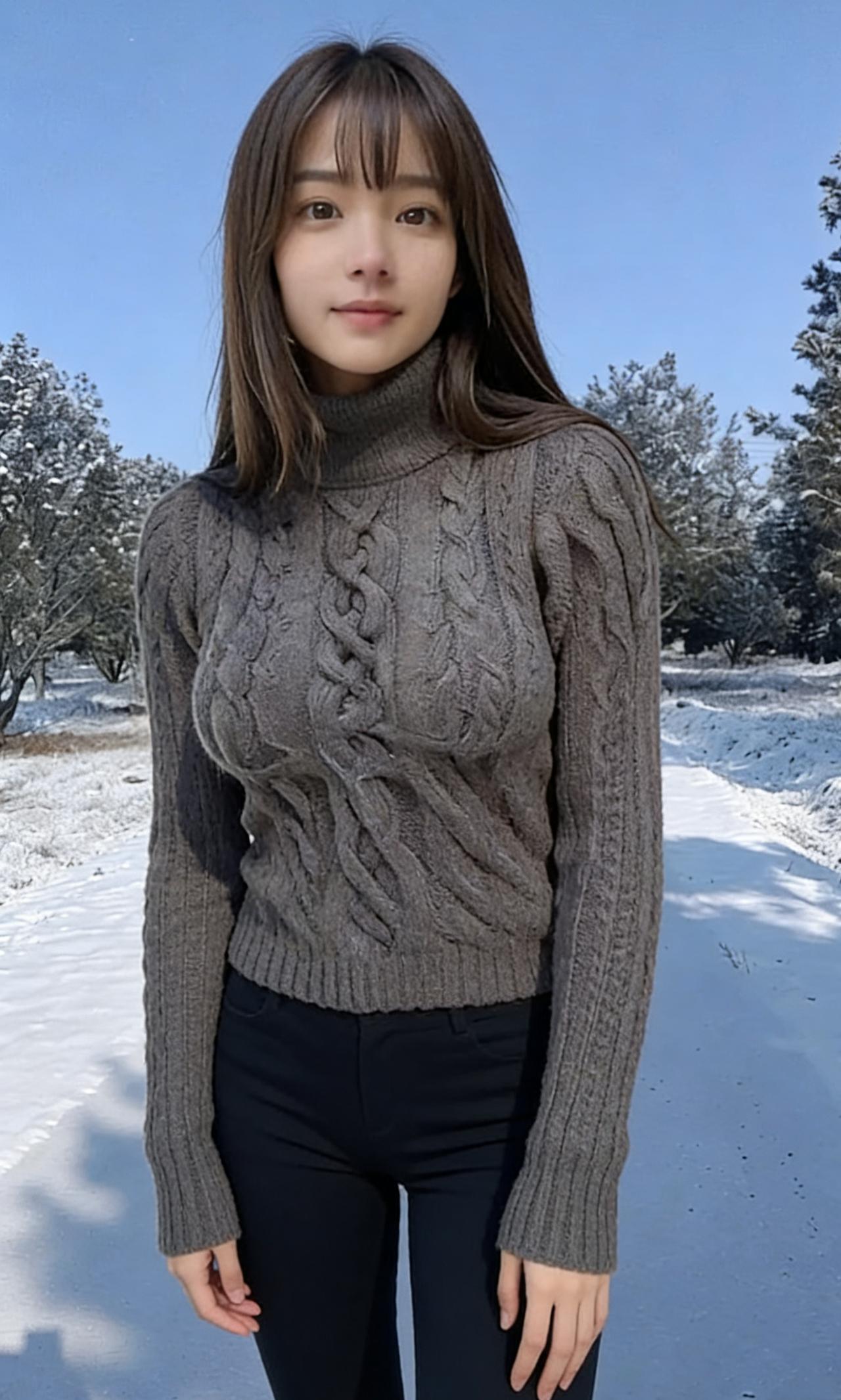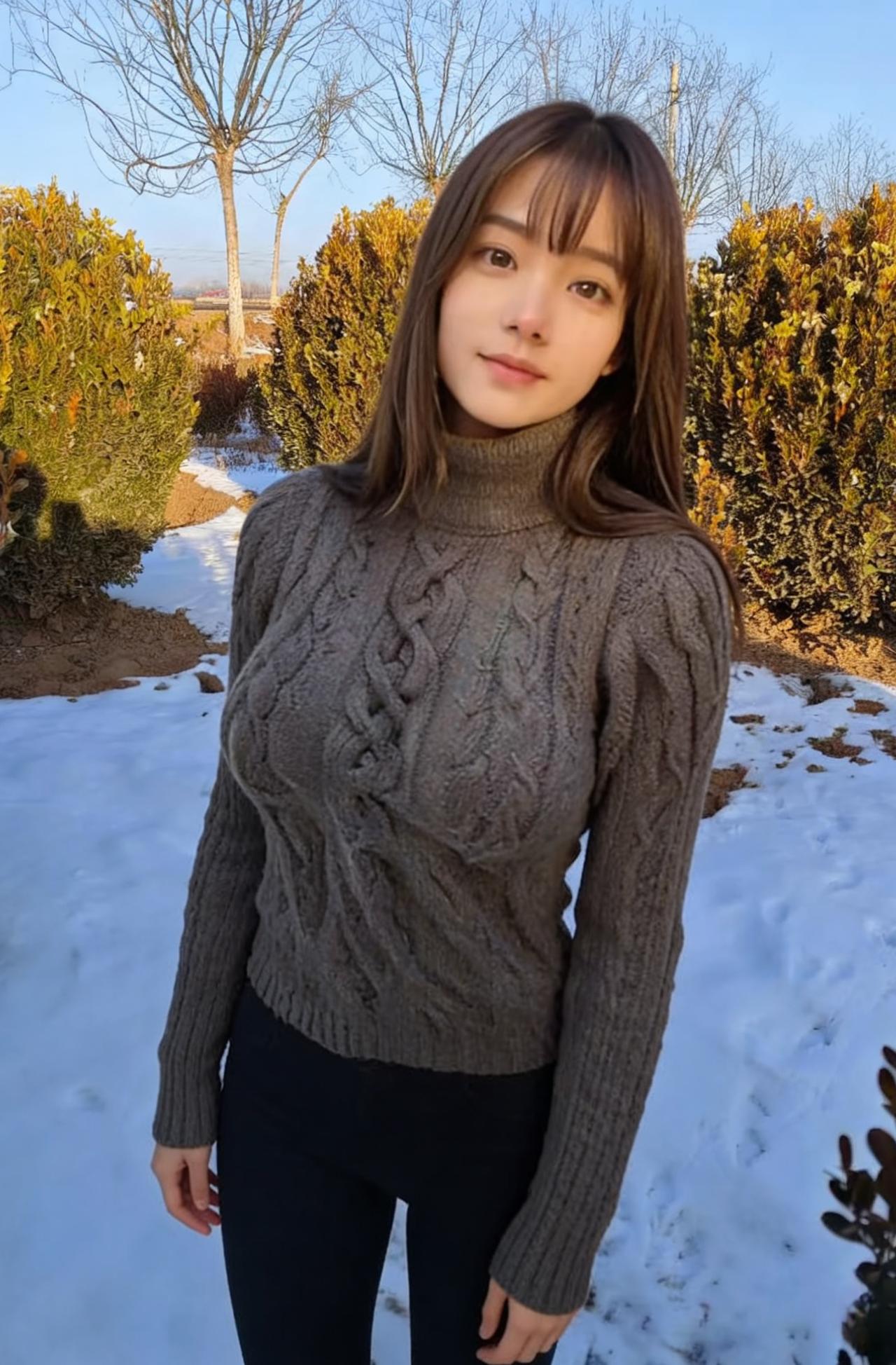 平芜尽处雪初匀,独立芳姿绝俗尘。 高领毛衣萦暖意,轻颦眉黛锁春颦。 眸凝远岫千峰