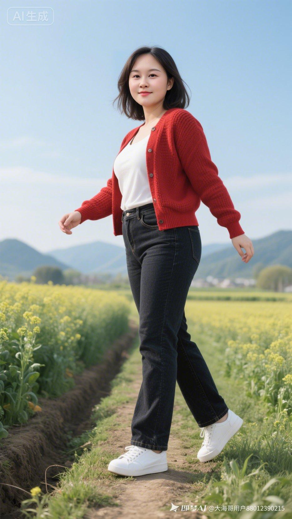 春日田野漫步,红衣少女与花海相映成趣。