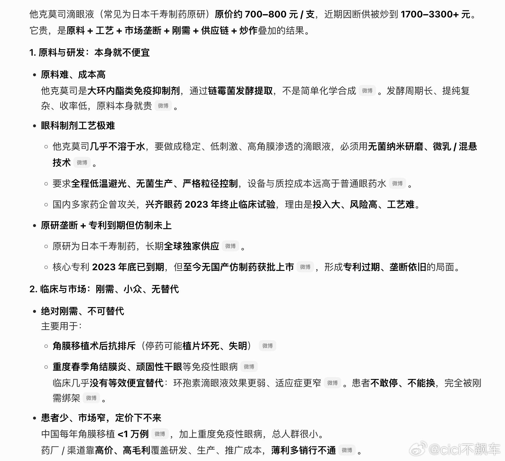刚查了一下线上的价格,小小一罐价格不便宜啊,医院断供,线上天价,目前还真没替代品。这个药主要用于角膜移植术后抗排斥、重度春季角结膜炎、顽固性干眼等免疫性眼病。