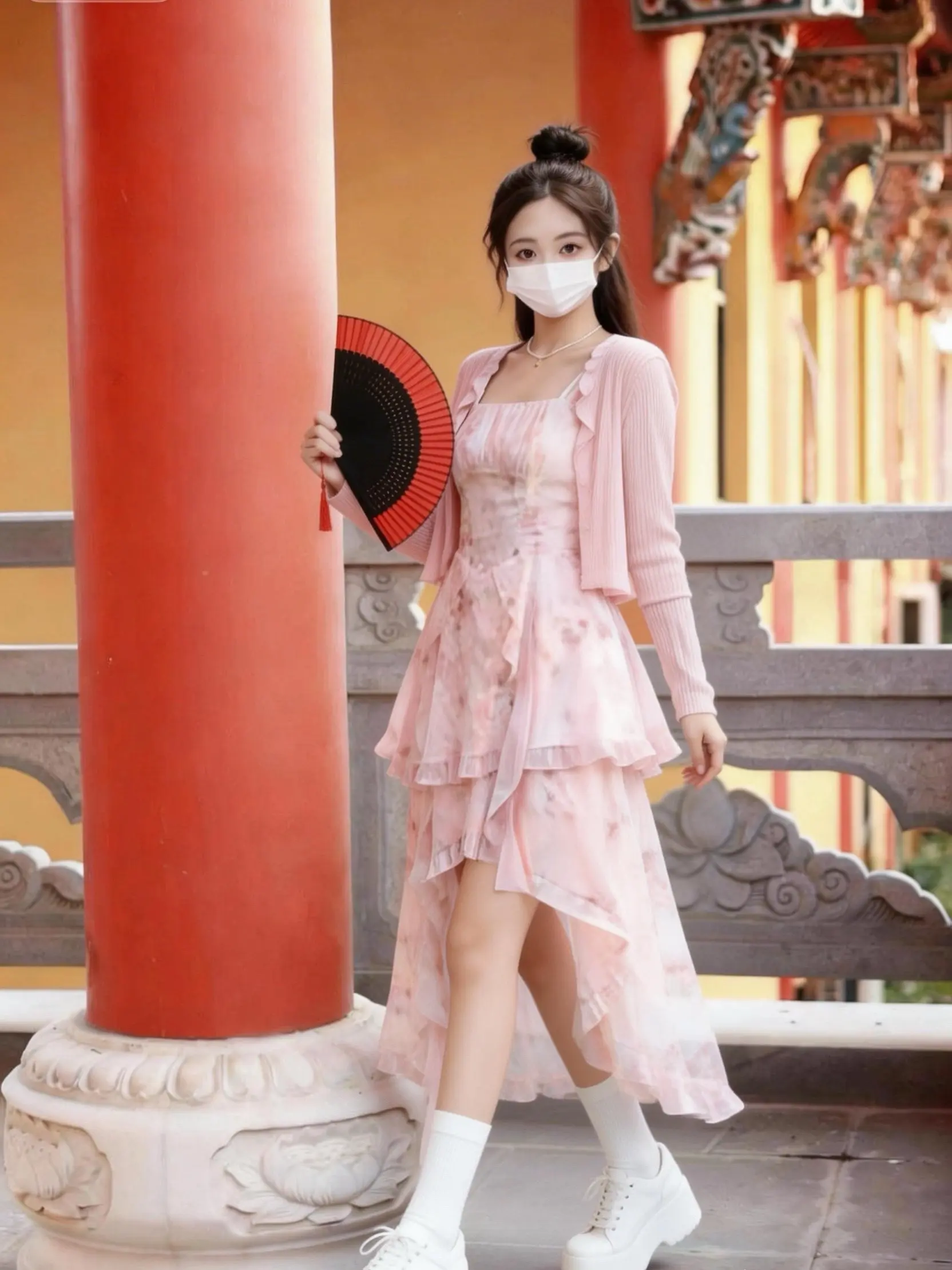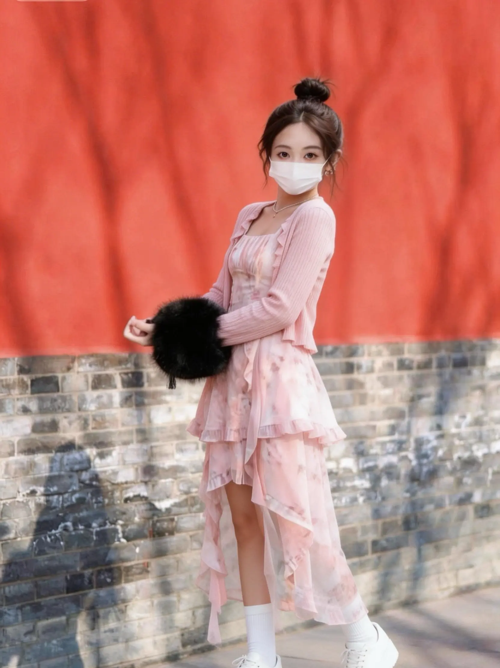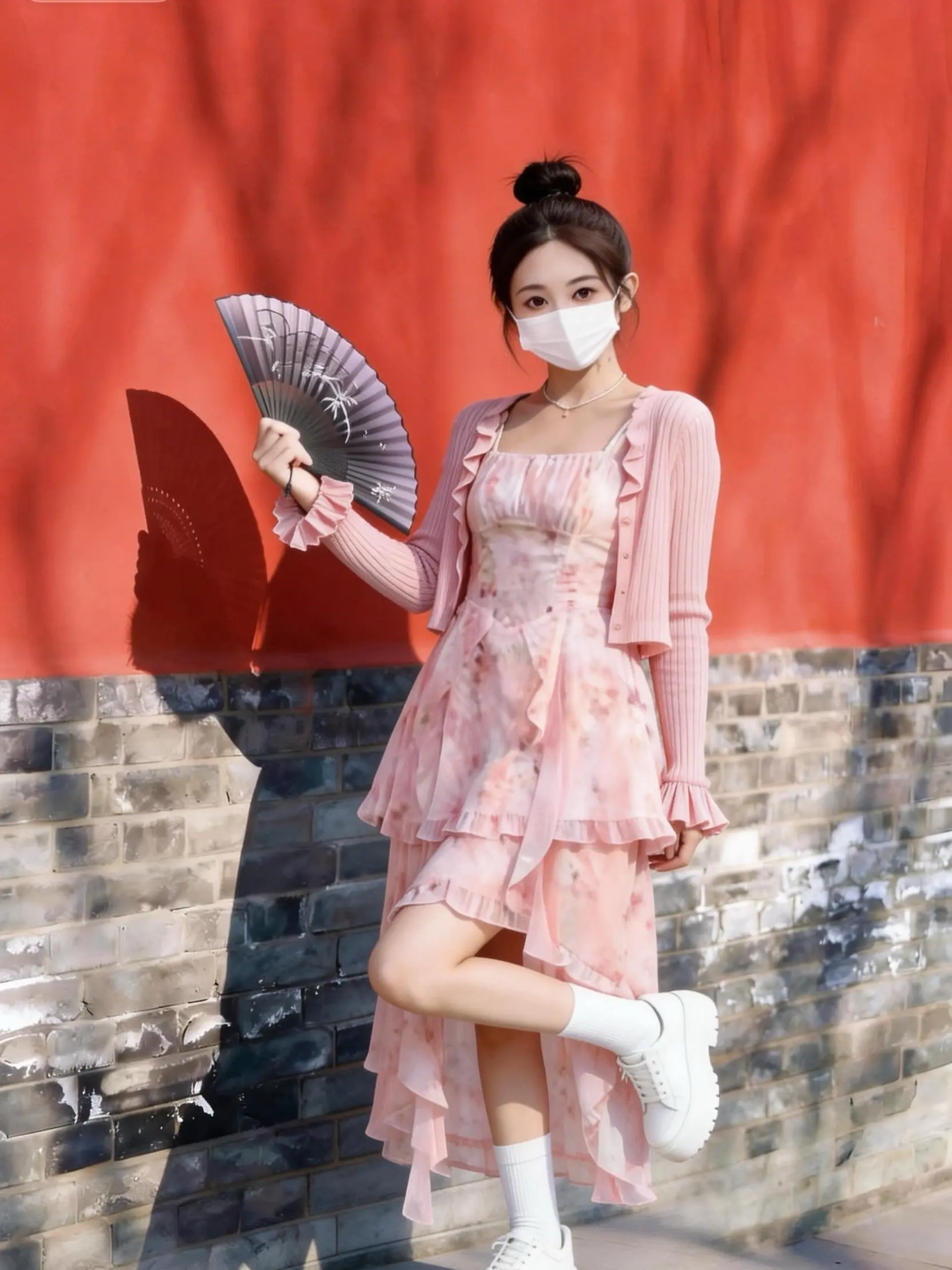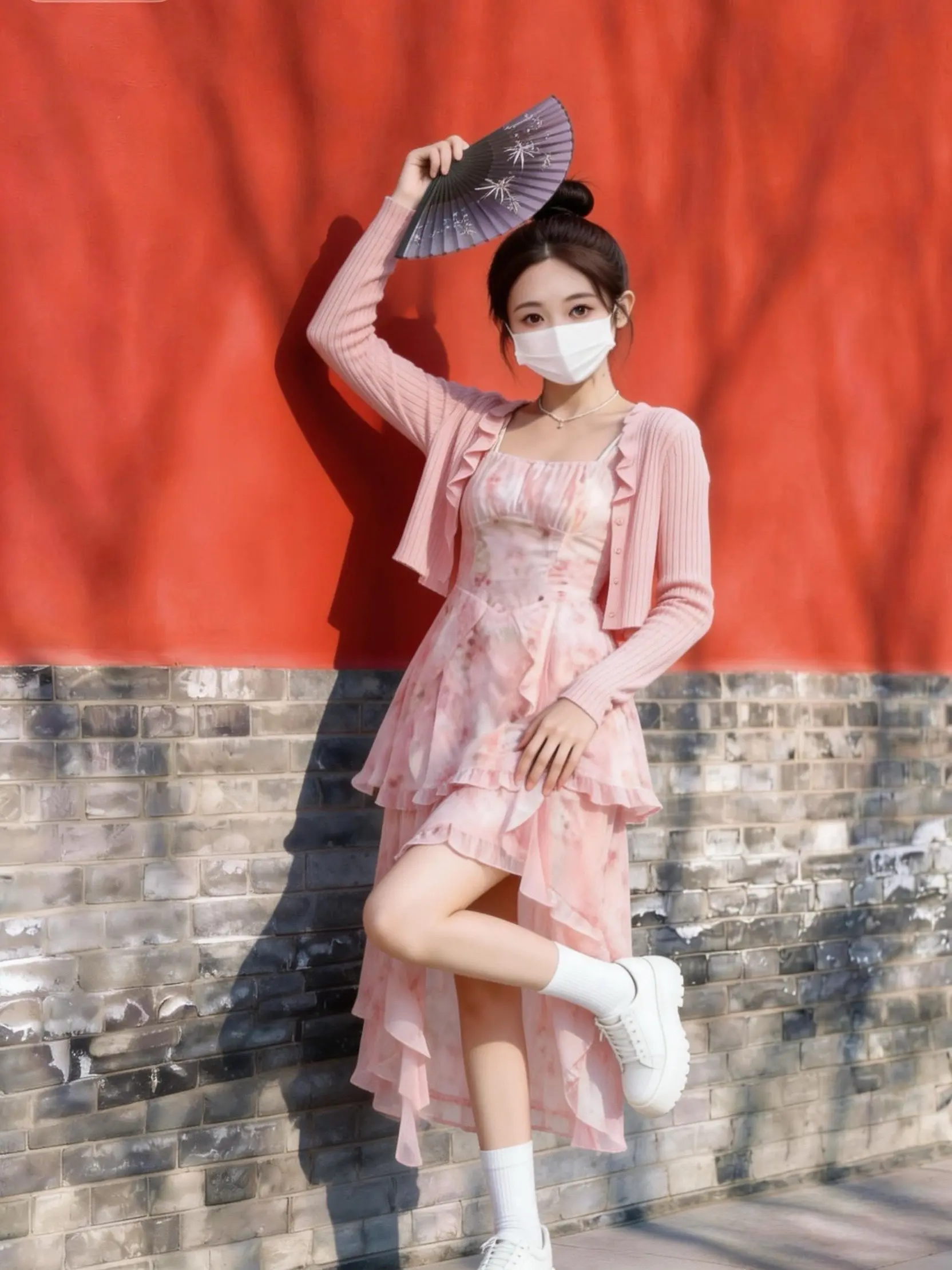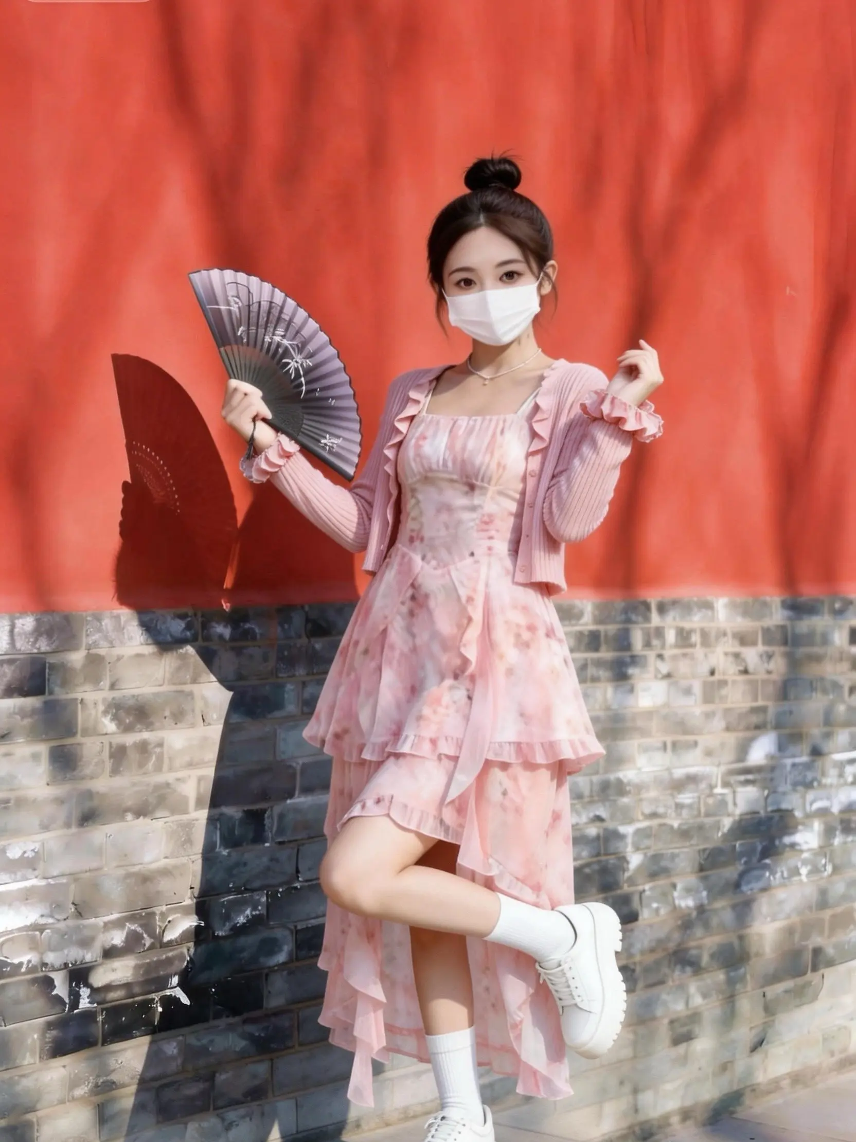 搭配小白鞋和折扇,在红墙下拍照超出片!