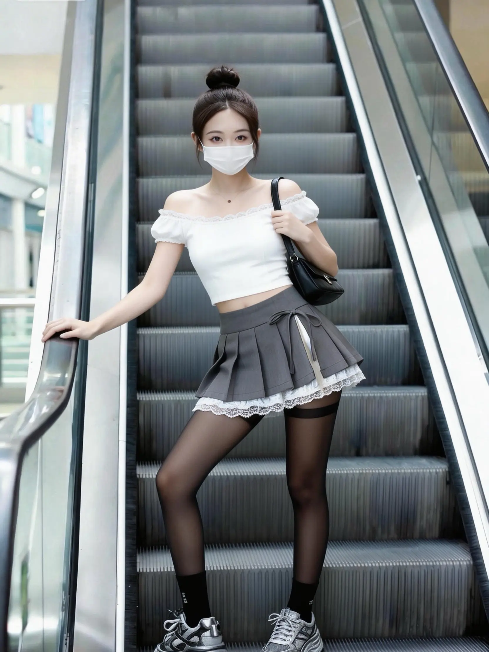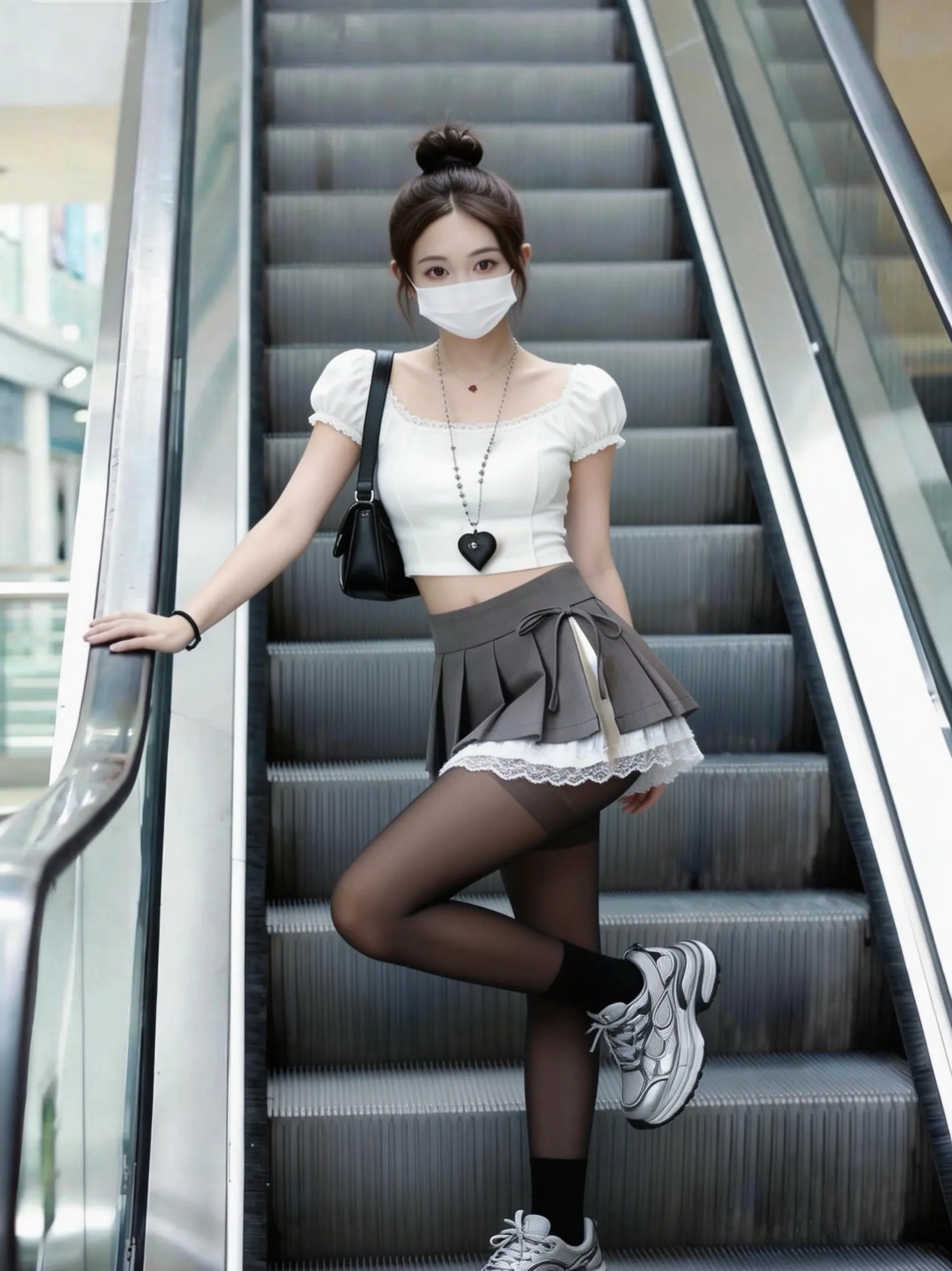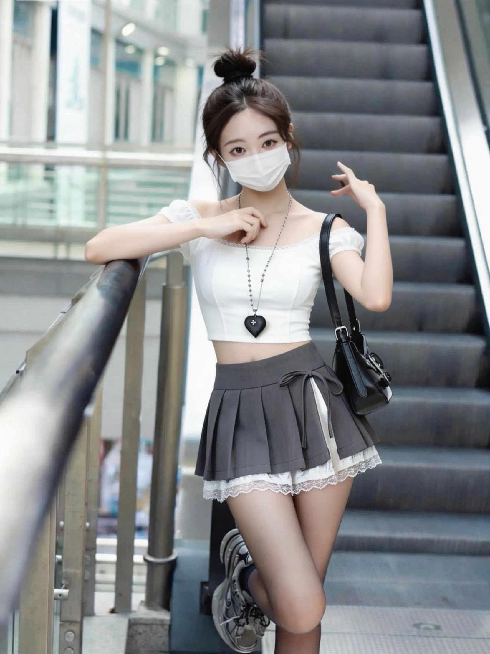 一字肩短上衣+灰色百褶裙,露腰设计显高又显瘦,