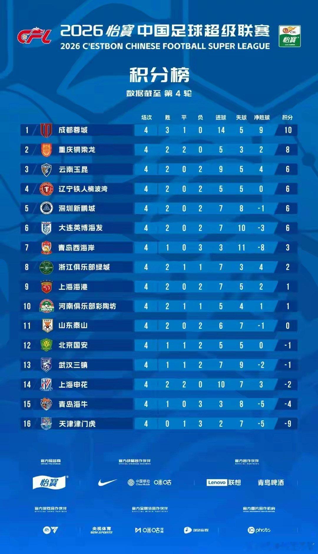 2026中超四轮格局剧变:西南双雄领跑颠覆传统,罚分+务实革新重塑联赛生态中超 2026赛季中超联赛战罢四轮,积分榜迎来颠覆性变局,彻底打破了过往数赛季传统豪强垄断上游的固有格局。成都蓉城与重庆铜梁龙这对“西南双雄”高居积分榜前两位,而天津津门虎、上海申花、北京国安等老牌劲旅却深陷积分榜下游,巨大反差成为本赛季中超最引人瞩目的现象。这并非偶然的赛场冷门,而是多重因素叠加作用下的必然结果。罚分重塑格局,豪门负重前行本赛季中超升班马与中下游球队集体崛起、抢占高位,最直接的导火索便是联赛罚分政策带来的格局重构。赛季之初,中国足协就多支传统球队历史违规问题开出重磅罚单,上海申花、天津津门虎各被扣10个联赛积分,山东泰山也被扣除6分。一众老牌强队从赛季起步便背负沉重积分包袱,陷入被动追分的困境。四轮赛程密集,每一分都至关重要。被罚分的豪门球队不仅要应对正常赛场竞争,还需全力弥补积分缺口,容错空间被极度压缩。一旦遭遇平局或失利,积分差距便会持续拉大,彻底陷入被动。反观成都蓉城、重庆铜梁龙等球队,均未受罚分影响,轻装上阵全身心投入赛事,得以牢牢把握抢分时机,快速积累积分,天然占据竞争优势。战术务实致胜,以弱胜强成常态战术层面的务实革新,让中小球队频频实现以弱胜强,冷门迭出成为联赛常态。作为升班马的重庆铜梁龙,并未盲目照搬豪门的传控打法,而是立足自身阵容特点,坚守稳固防守、快速反击的务实思路。其五后卫防守体系成效显著,四轮仅丢3球,防守效率稳居联赛前列。面对实力更强的对手,球队主动让出控球权,专注中场拦截与边路快速转换,依托外援个人能力与本土球员默契配合,打出高效反击,斩获远超预期的积分。成都蓉城则在原有稳定基础上持续优化攻防体系,既保有中场掌控力,又强化了边路突破与门前终结效率,对阵强队毫不怯场,面对弱队稳扎稳打,展现出成熟的联赛竞争力。其余中下游球队也纷纷效仿这一思路,放下身段立足防守,摒弃过往追求场面华丽的打法,凭借高强度跑动、密集防守限制对手,依靠定位球、反击等机会得分。这种“以巧取胜”的战术风格,完美适配当下中超的竞争环境。引援精准高效,阵容磨合占优球队阵容稳定性与引援精准度,更是中小球队脱颖而出的关键。随着豪门大牌外援相继离队,中超各队实力差距大幅缩小,为中下游球队创造了更多机会。重庆铜梁龙、成都蓉城等队冬窗并未进行大规模阵容洗牌,而是保留核心球员框架,同时针对性引进高性价比外援与本土球员。外援虽非大牌身价,但功能定位清晰,能快速融入战术体系;本土球员年轻且活力充沛,体能充足、拼劲十足,球队磨合度拉满,无需经历阵容适应的阵痛期。而部分传统豪门则处境艰难:要么受财务因素制约,引援力度大幅缩水,核心外援离队后未能及时补充即战力;要么阵容老化问题突出,老将居多的班底在密集赛程中体能透支严重,攻防转换速度远不及年轻球队。再叠加罚分带来的心理压力,球员场上发挥频频失常,自然难以取得理想战绩。2026赛季中超的格局突变,堪称联赛发展的重要转折点。新兴势力的集体崛起,让联赛竞争更趋激烈、观赏性大幅提升,既是对中小球队务实耕耘的嘉奖,也为中超长远发展注入全新活力。究竟是黑马一黑到底,还是传统豪门逆势翻盘,后续联赛征程依旧充满悬念,值得持续期待。