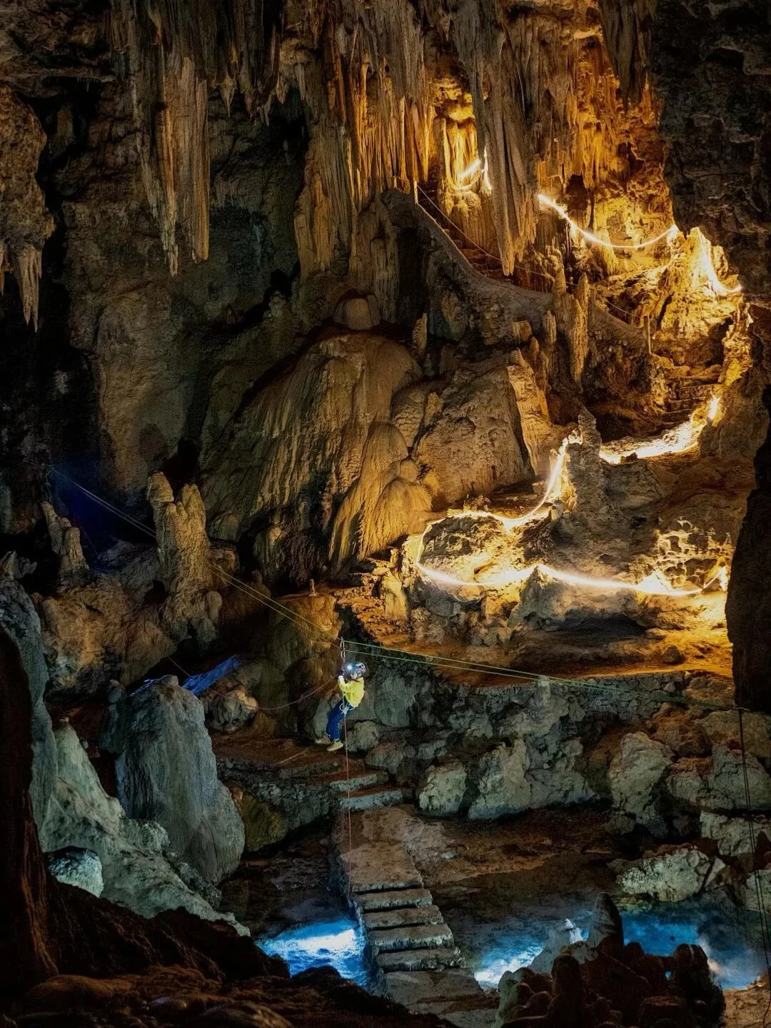 🔸 钢索桥+飞拉达:在洞穴岩壁上攀爬,脚下是深渊,头顶是钟乳石
