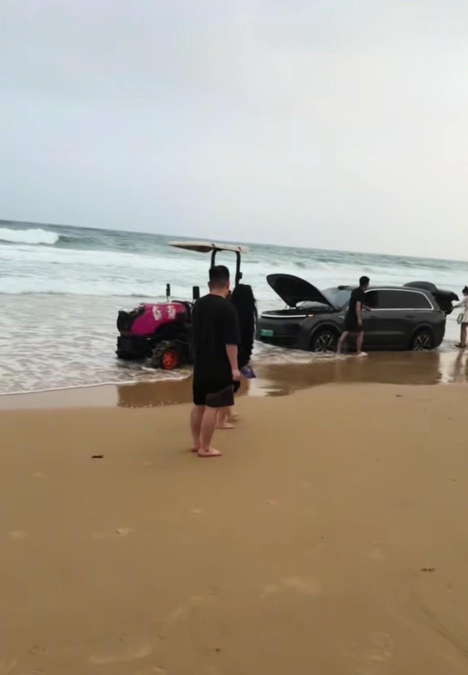 海南。男子开理想带着一个美女在海边耍帅,不想就这么陷在沙滩上出不来了,一开始是自己想开出来,反而越陷越深。再然后找了一辆小汽车在前面拉,后面很多人帮忙推,还是无济于事。最后据说找了一台拖拉机,才把车子拖出来……