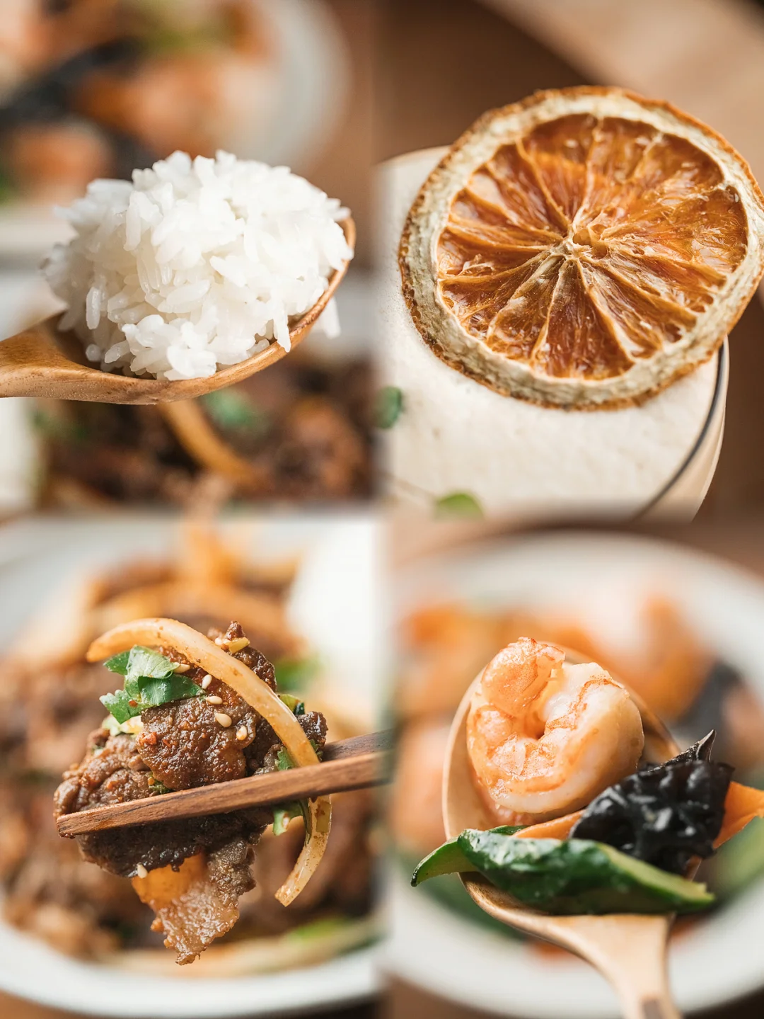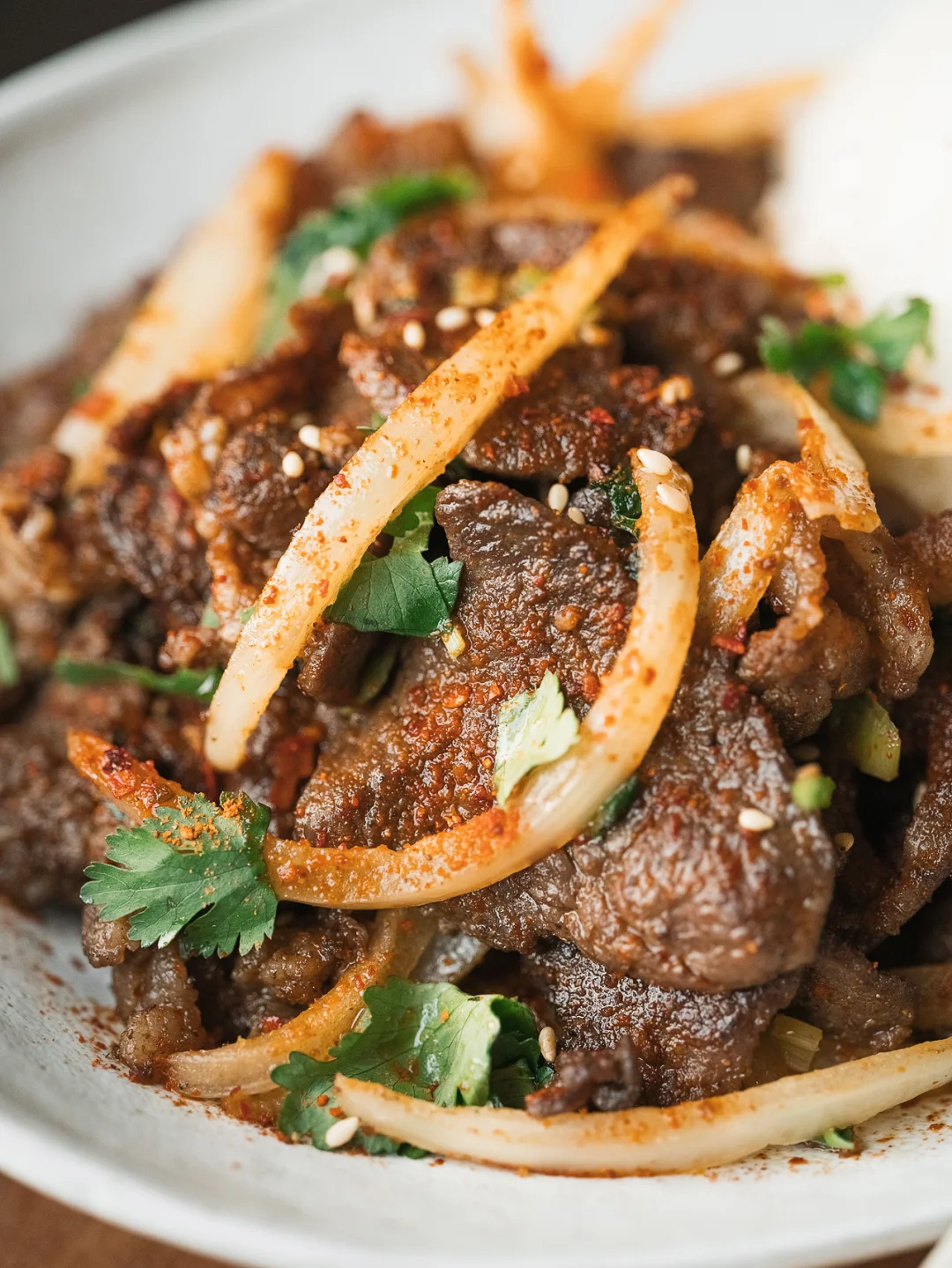 ❶将腌好的牛肉和洋葱煎香,加入香菜拌匀