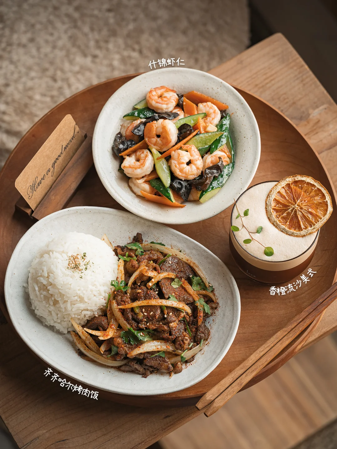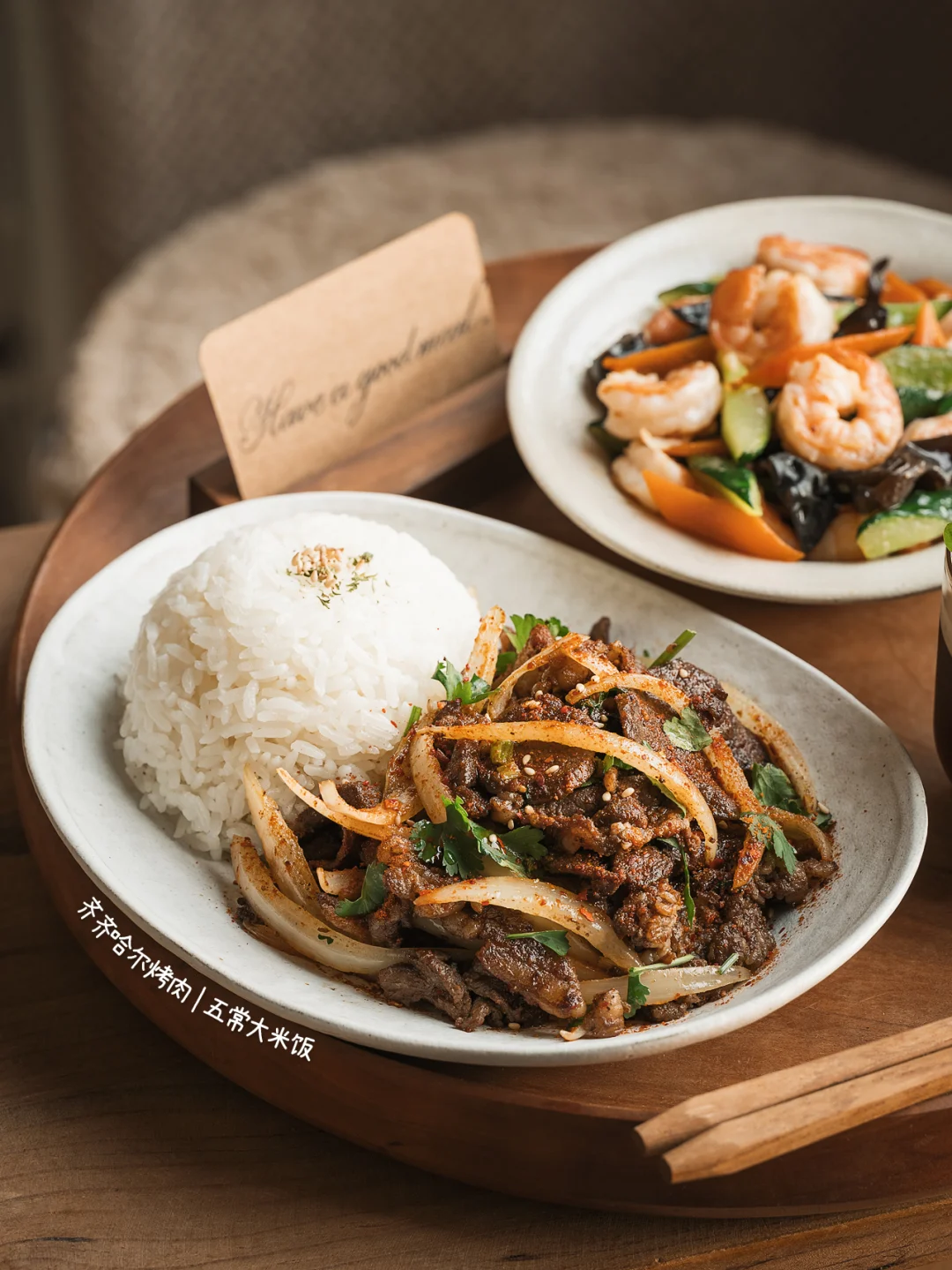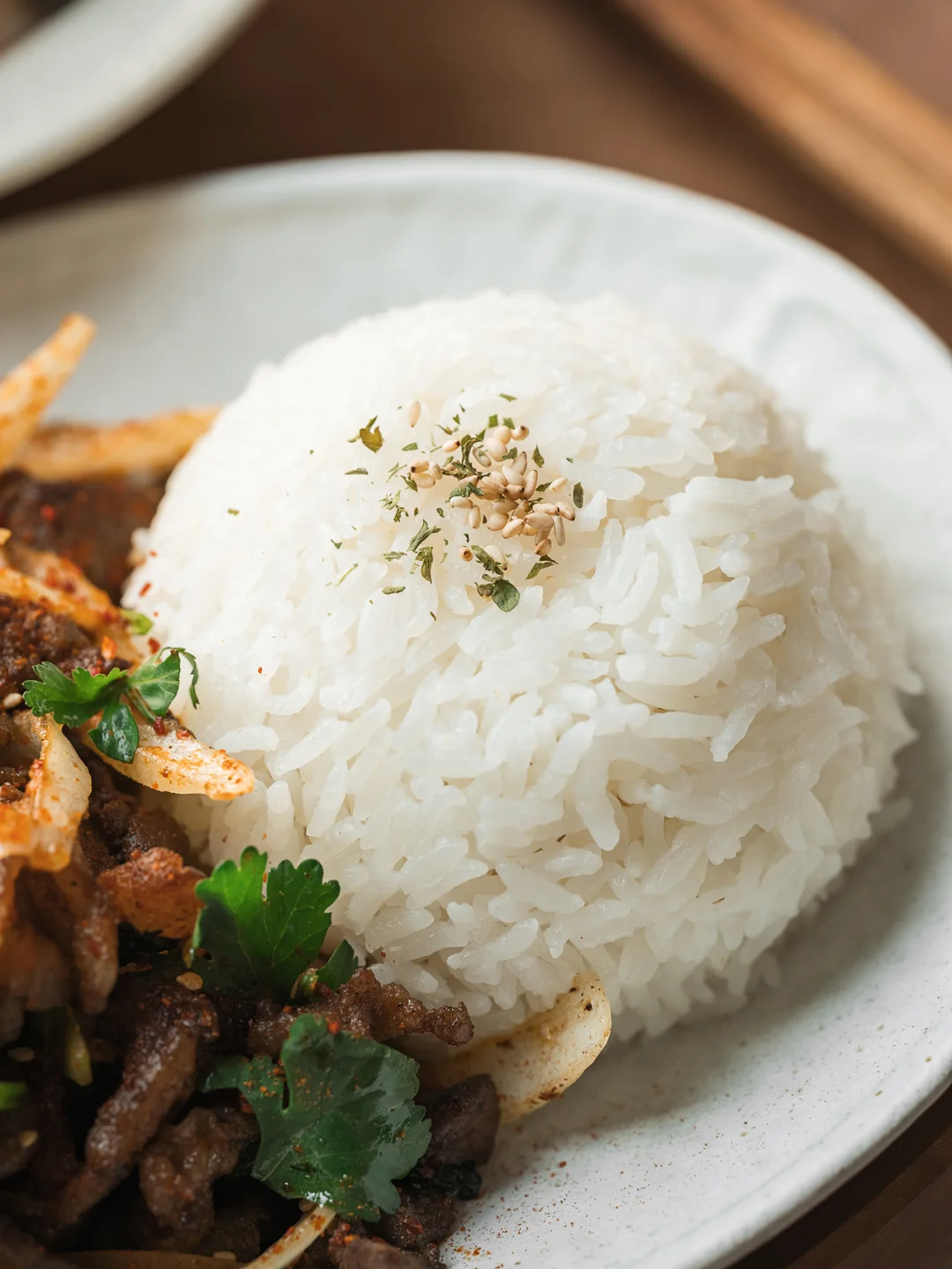 ❷和米饭摆盘,点缀芝麻和烧烤料