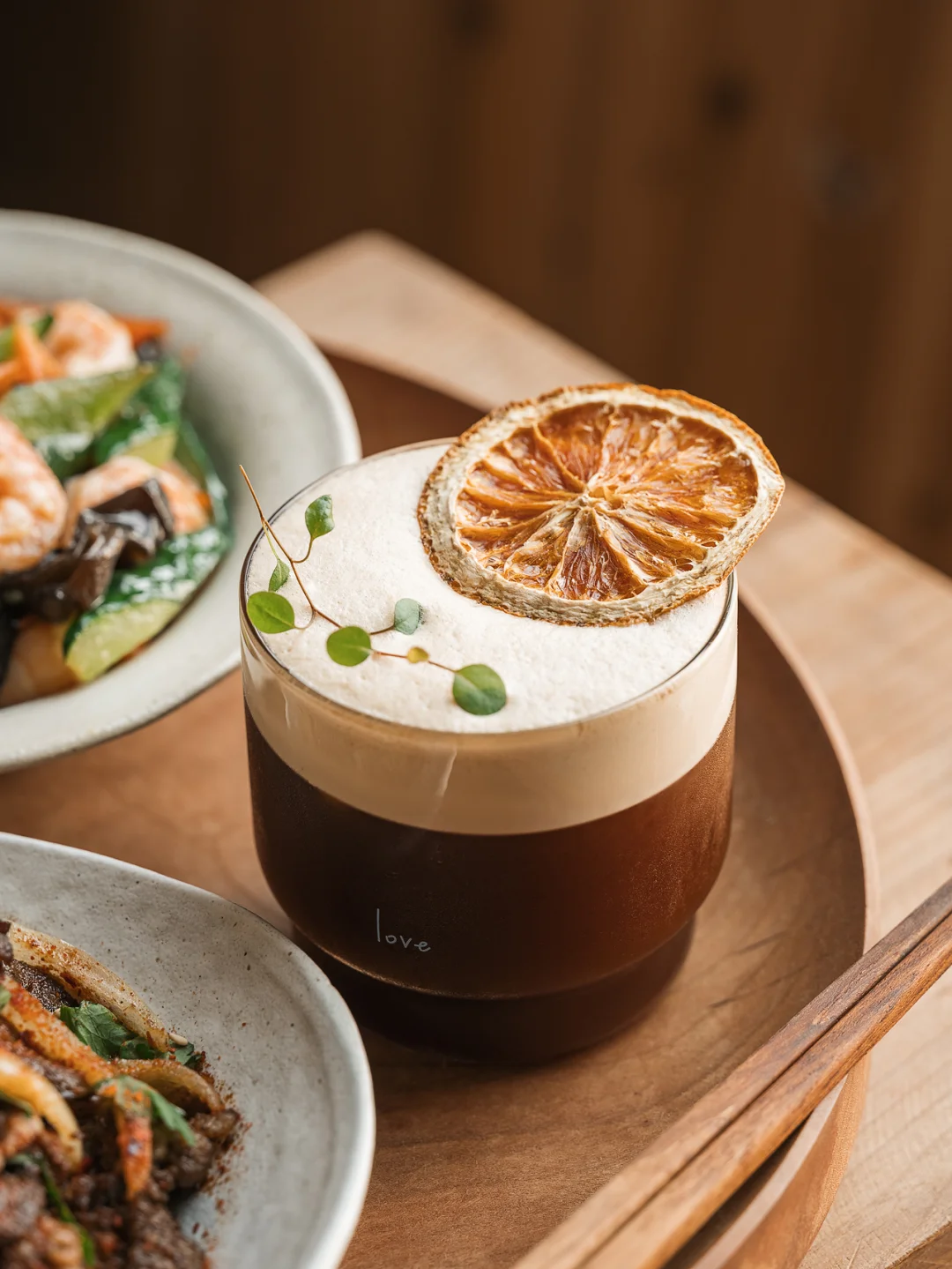 ❷用蒸汽打出泡沫,再倒入杯中,点缀橙片