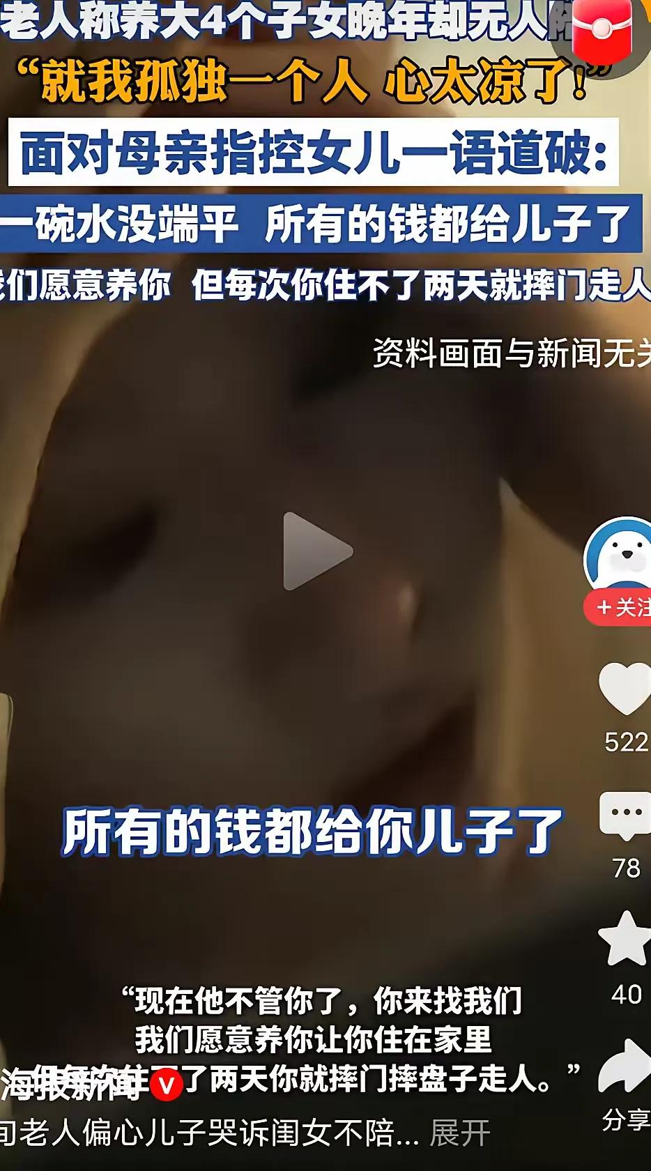 老人也承认自己有错,哭诉着说心里的委屈。可这局面,真的不是一天造成的。很多父母总觉得“儿子才是根”,把所有资源都倾斜给儿子,对女儿不管不顾,觉得女儿早晚要嫁出去、是外人。