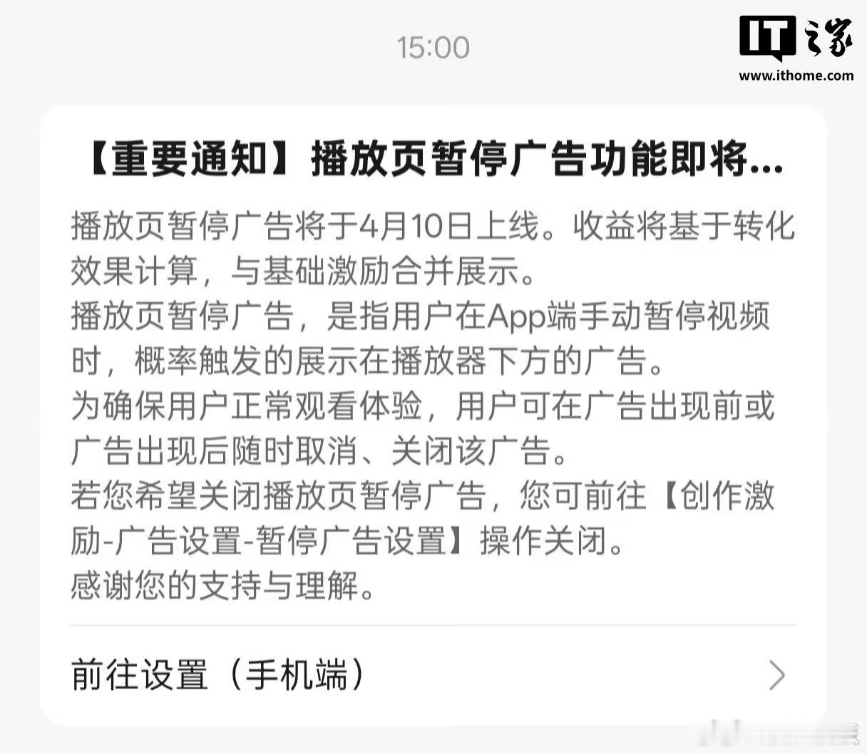 B站将上线播放页暂停广告4月10日,哔哩哔哩(B站)将上线播放页暂停广告。为确保用户正常观看体验,用户可在广告出现前或广告出现后随时取消、关闭该广告。若 UP 主希望关闭播放页暂停广告,可前往“创作激励-广告设置-暂停广告设置”操作关闭。据网友晒出的设置页面,播放页暂停广告并不是直接覆盖到视频之上,而是在视频下方显示,明确写有“广告”小字,用户可通过点击“×” 号关闭。