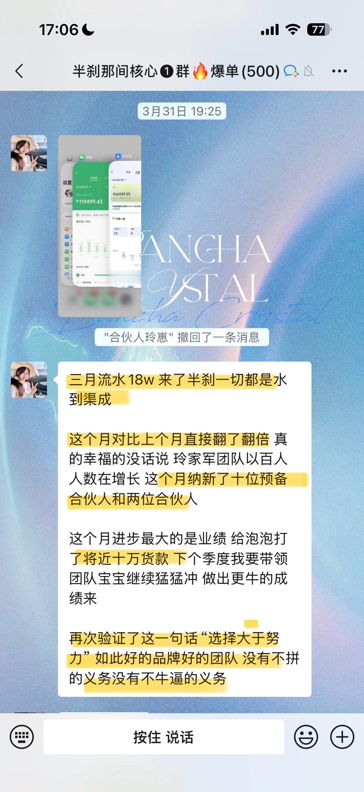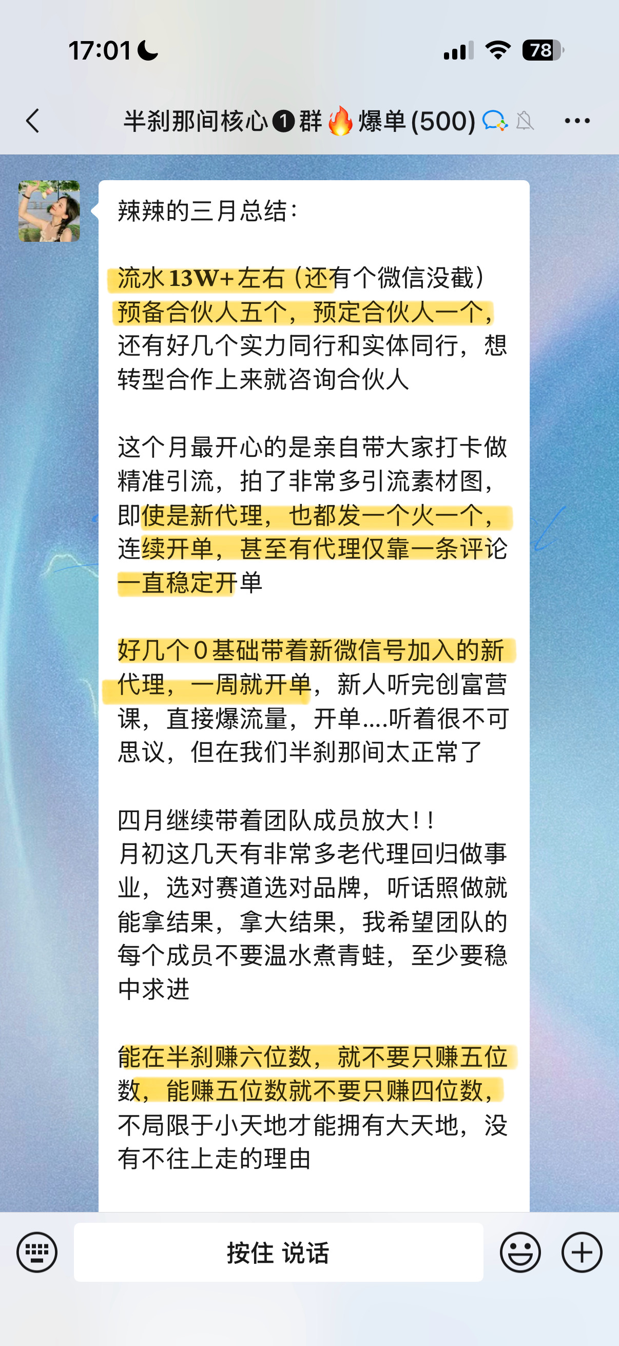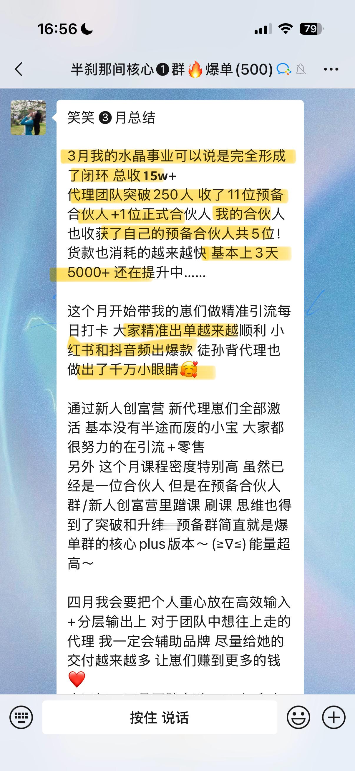 在这里不用怕团队流失 新人创富营全部带起来 预备合伙人群培养到位 每个级别的代理都在稳步成长