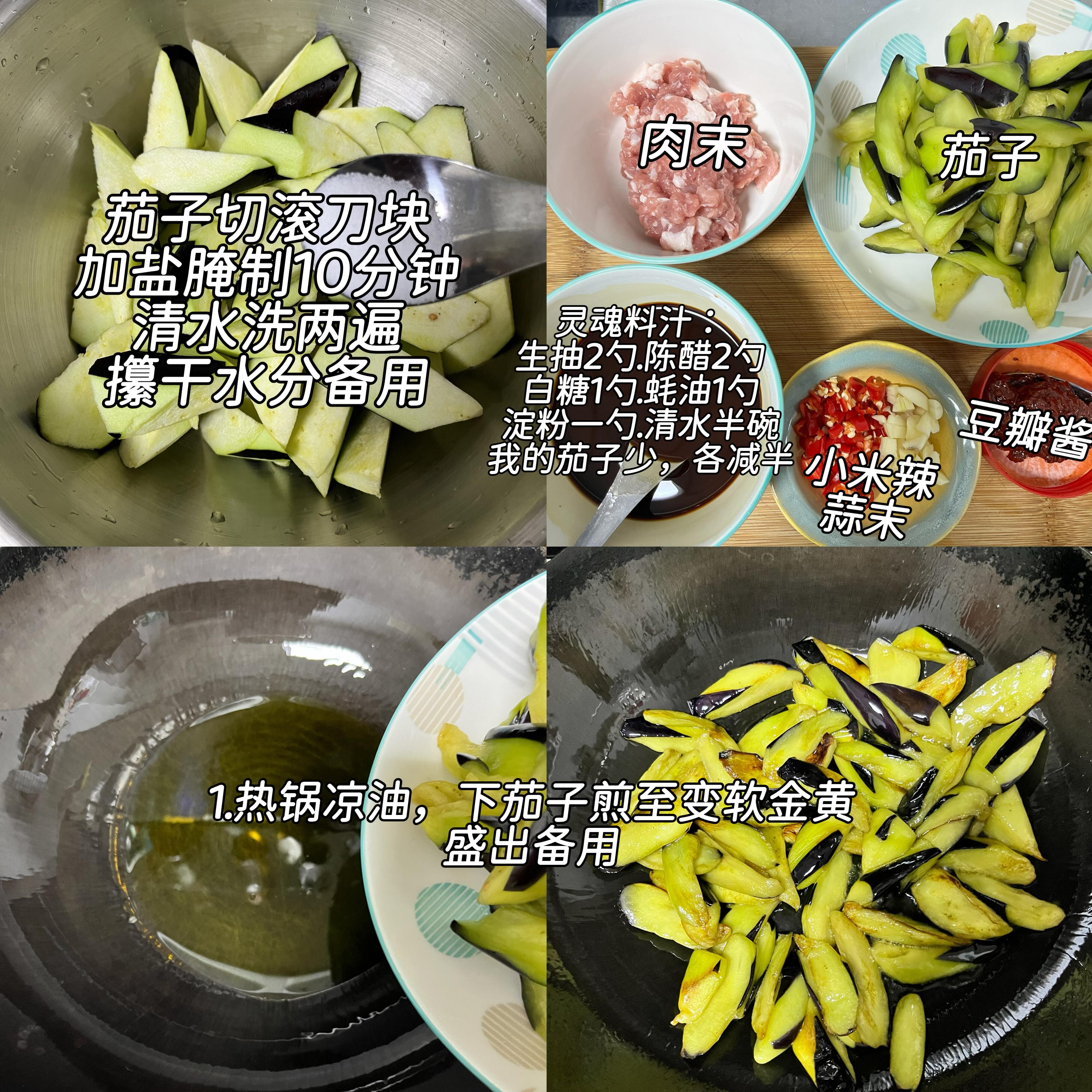 2️⃣ 锅里放少量油,放入挤干水的茄子,慢慢煎至变软、表面金黄,盛出来备用