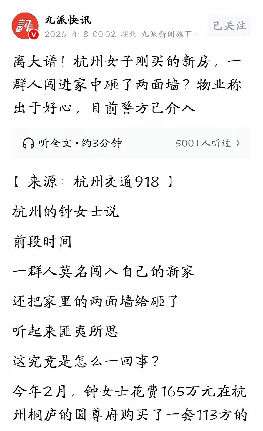 钟女士站在自己的新家里,看着主卧和次卧那两面被砸开的墙,碎砖块堆了一地,心里堵得慌。这是她今年二月才买的房子,113平米,精装修,花了165万。一家人满心欢喜,就等着五一劳动节搬进来。