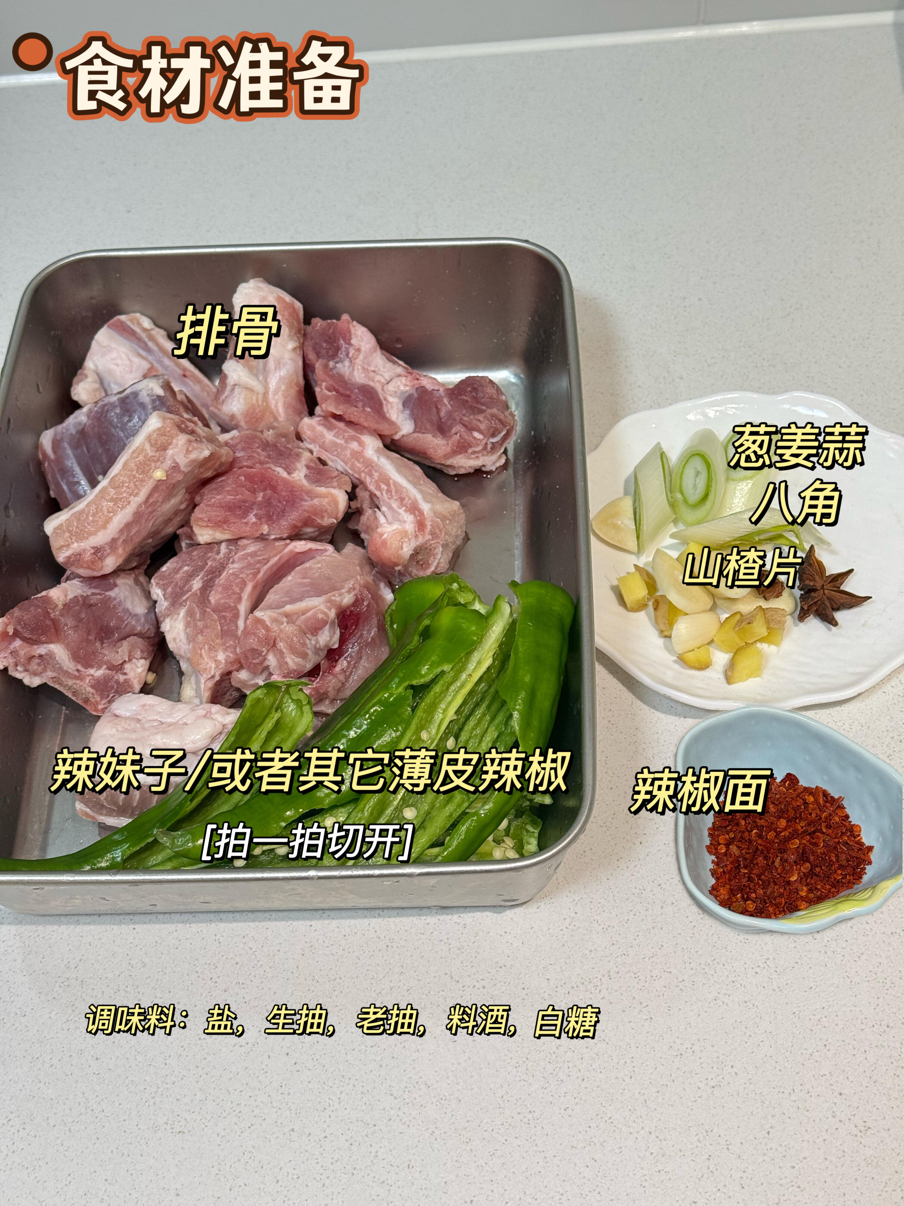 排骨、辣妹子(或其他薄皮辣椒)、葱姜蒜、八角、山楂片、辣椒面​