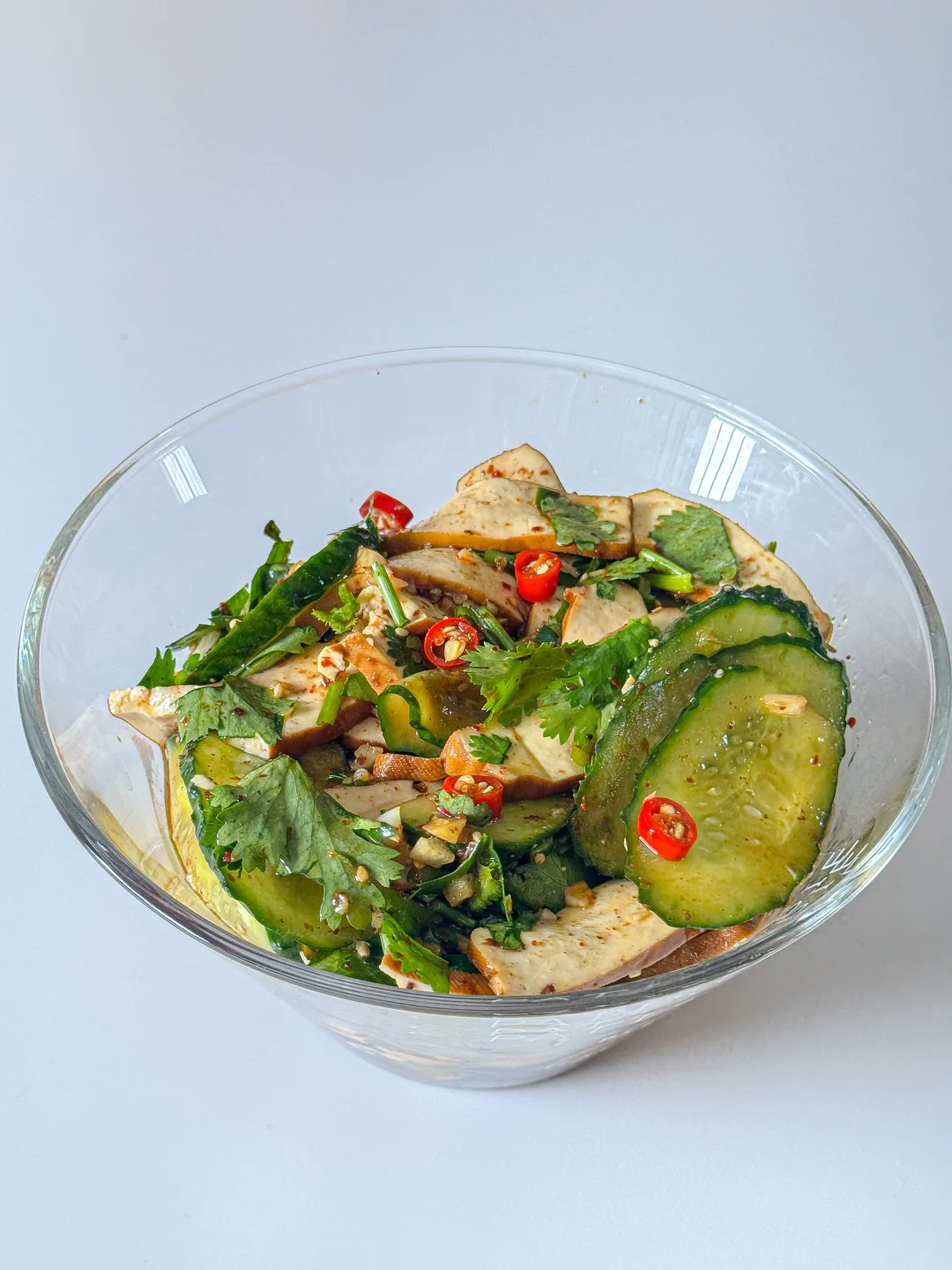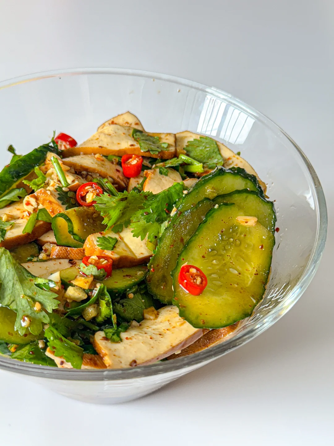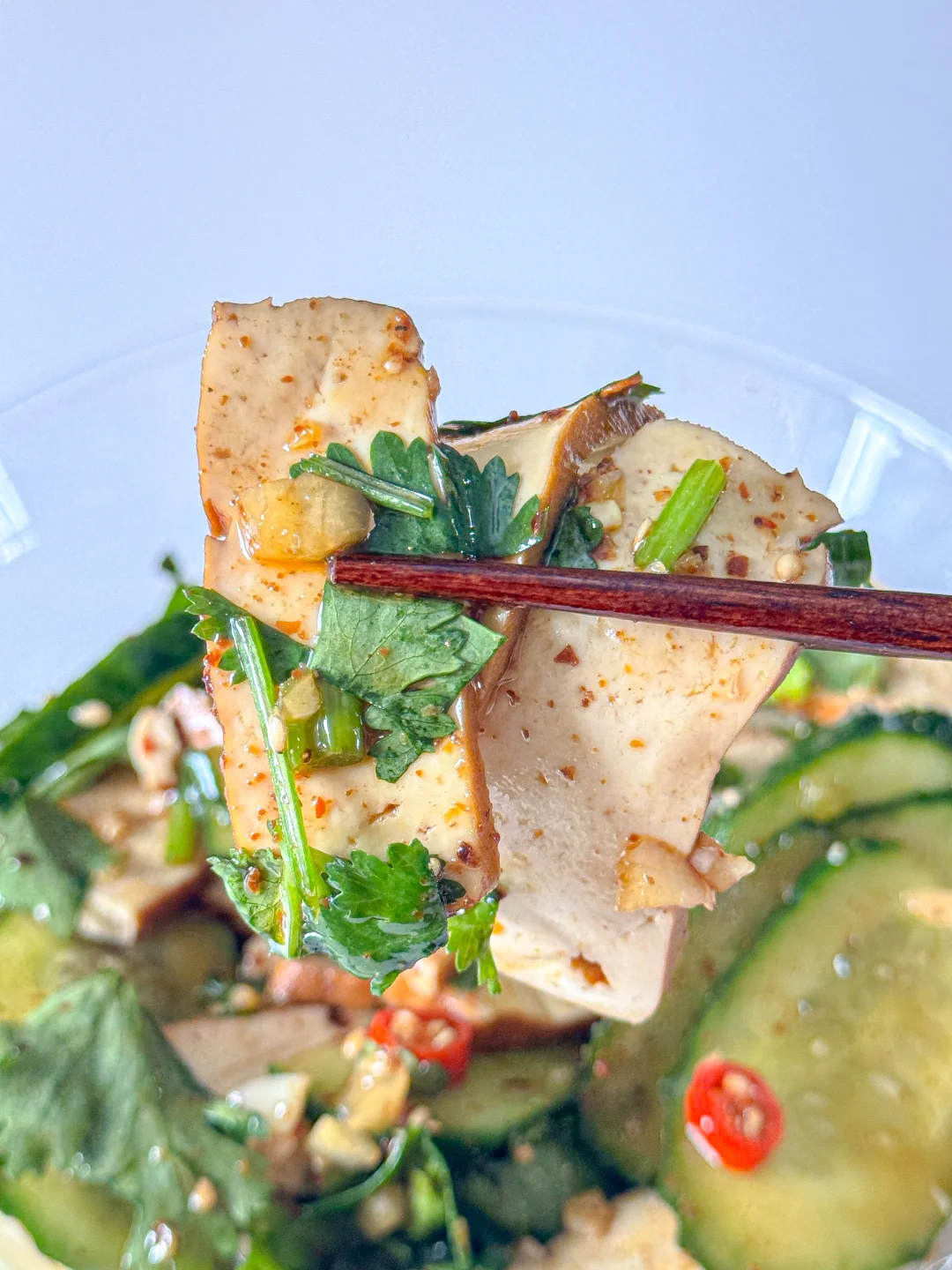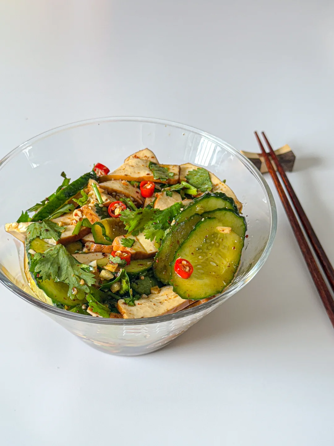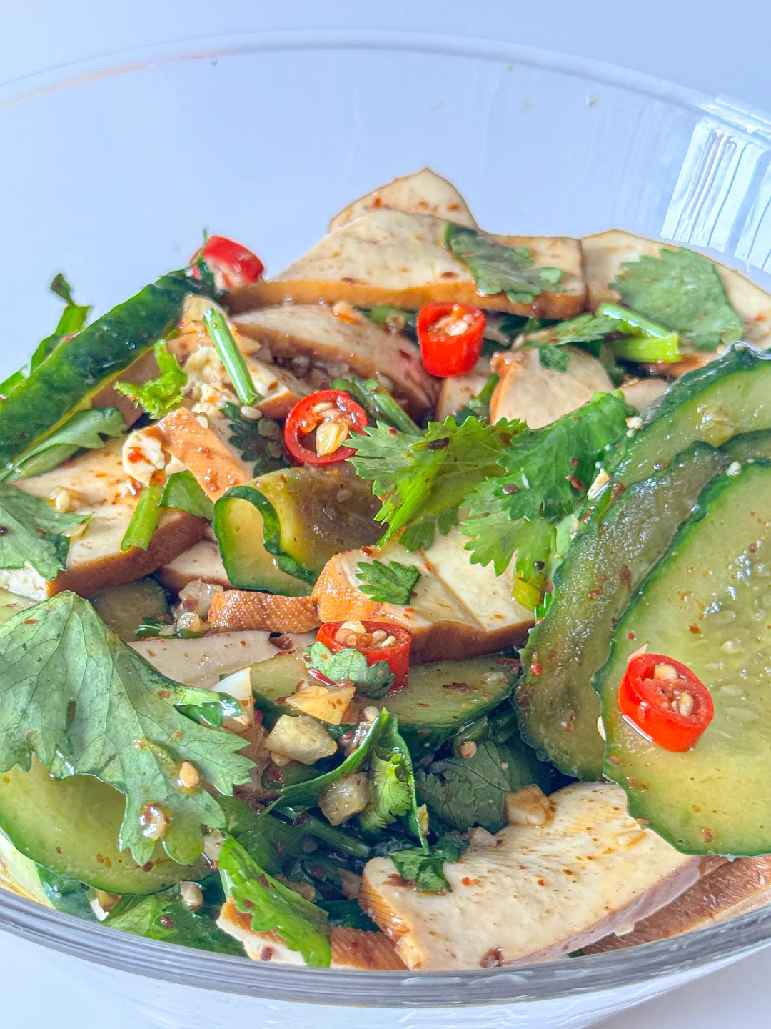 1️⃣ 豆干开水煮1分钟捞出,加黄瓜片和香菜