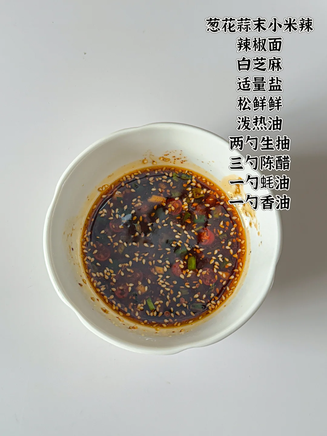 1️⃣ 碗里放葱花、蒜末、小米辣、辣椒面、白芝麻