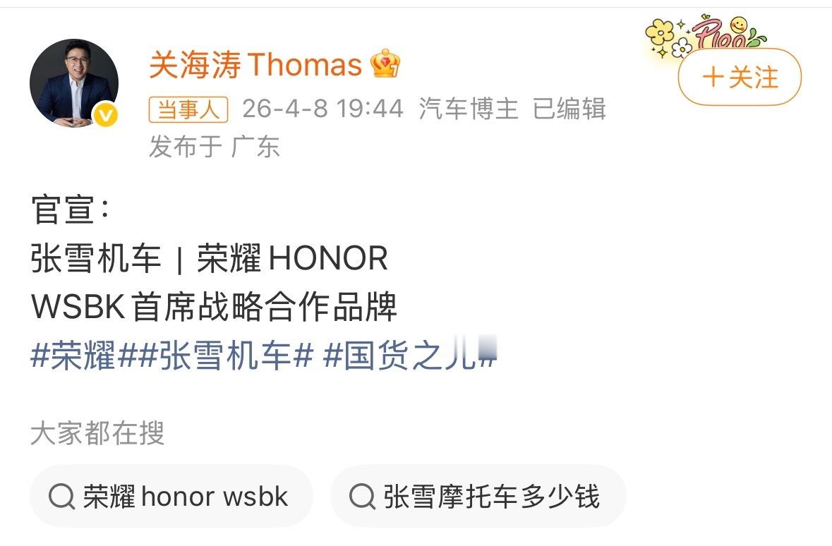 荣耀张雪机车战略合作是好事啊!有品牌助力会走得更远~