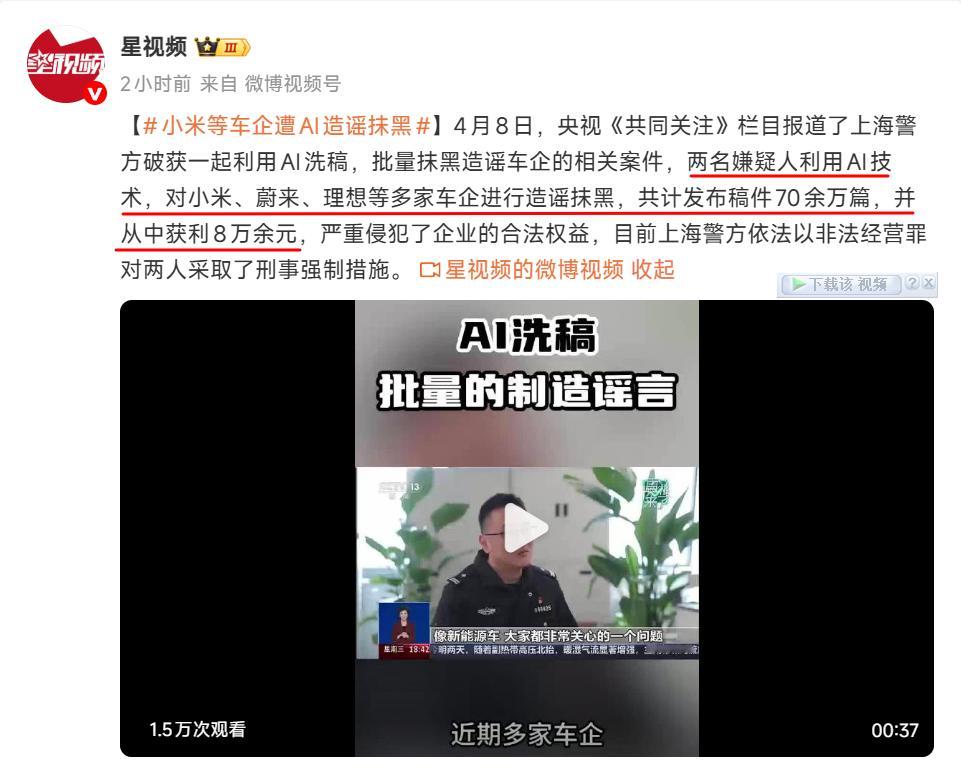 小米等车企遭AI造谣抹黑AI盛行的时代,AI工具也成为了造谣者的作案工具之一。 3月份上海警方抓获利用AI批量生成70万余篇黑稿,专门针对国产新能源汽车品牌,其中小米、理想、蔚来等车企都遭到了不实谣言的肆意抹黑,遭到了不同程度的品牌和声誉损失,如果不是警方披露细节,很难相信这仅仅只是一个两人作案团伙。 小米汽车在24年3月份发布上市后不久,全网都是铺天盖地的黑稿,其中短视频平台是较为严重的重灾区,从给事故视频投流,辱骂、诅咒车主到线下恶意损坏他人车辆,为此,小米法务团队重拳出击,坚决与车主站在一起,维护车主的基本权利,2026年4月2日,也迎来了首个民事诉讼的胜诉判决。 还是那句话:互联网不是法外之地,必须谨慎言行,切勿以身试法,可以有正向的批评,不能有恶意的抹黑造谣,因为带给品牌的声誉影响是不可估量的。