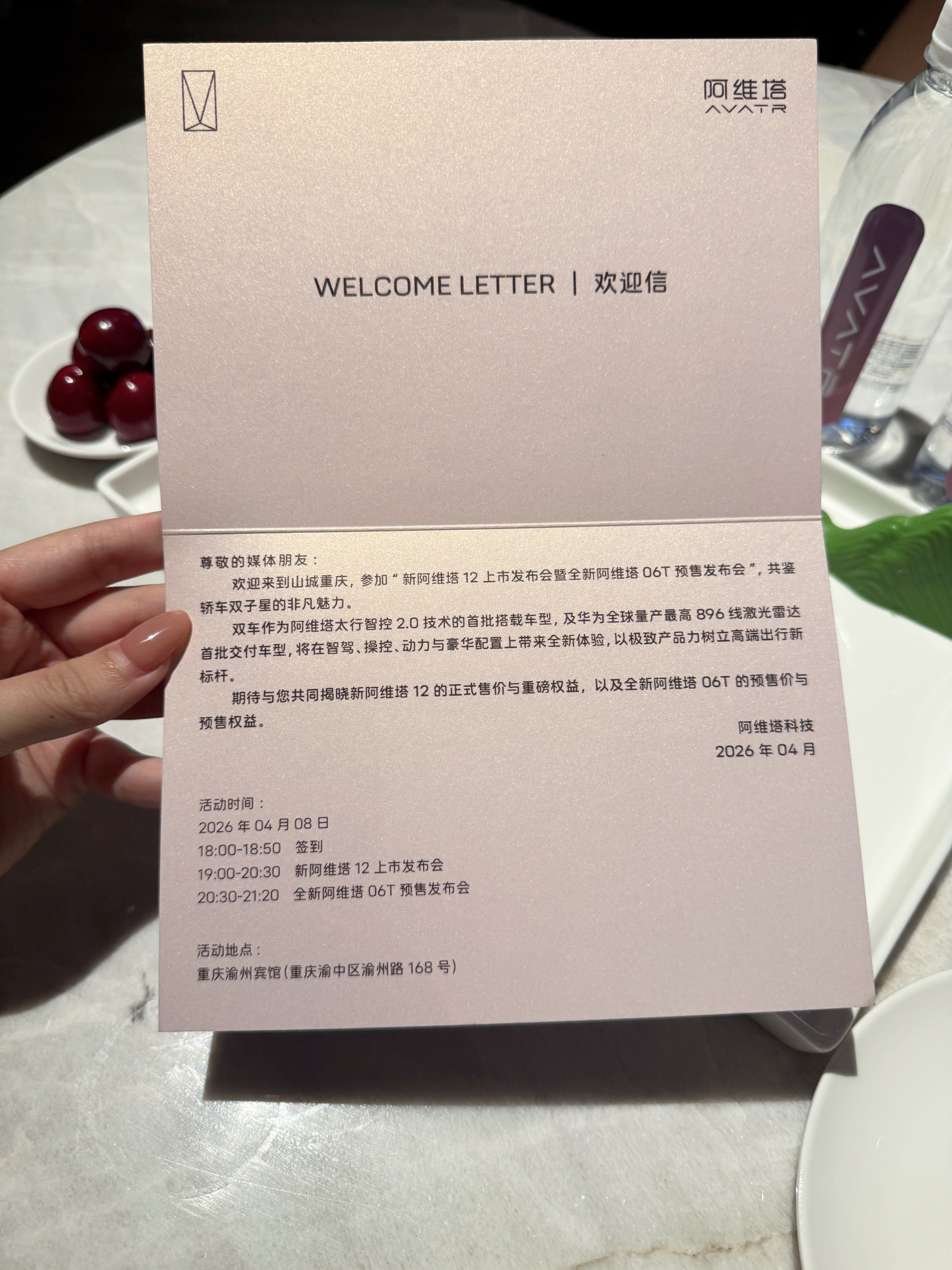 从酒店环境就能看出来这次发布会很用心,晚上不仅有新款阿维塔12正式发布,还有06T开启预售,两台车一起登场,已经开始期待今晚的亮相了!!