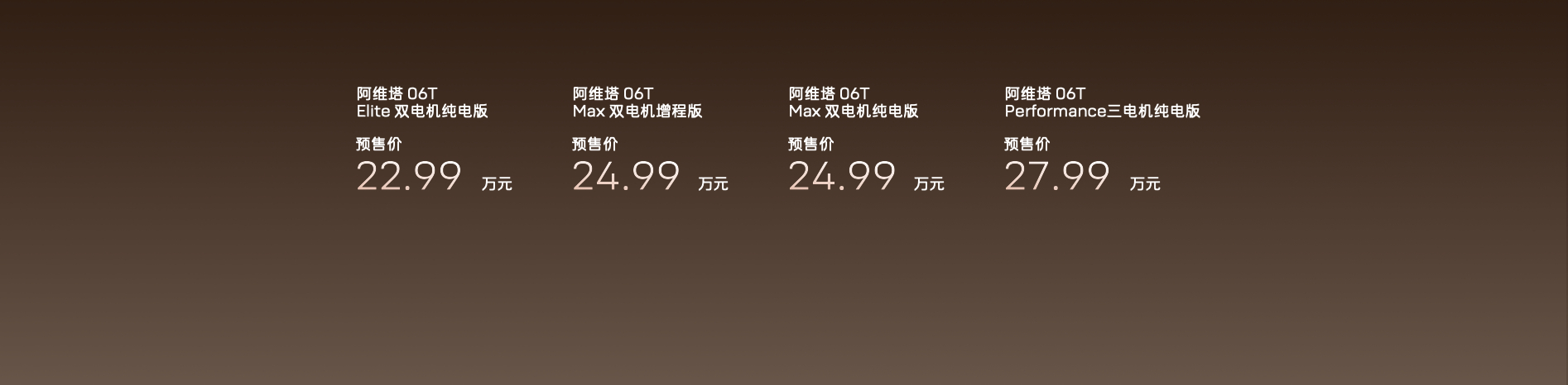 没想到阿维塔06T价格这么有惊喜,直接贴给大家看:Elite双电机纯电版 22.99万元Max双电机增程版 24.99万元Max双电机纯电版 24.99万元Performance三电机纯电版 27.99万元