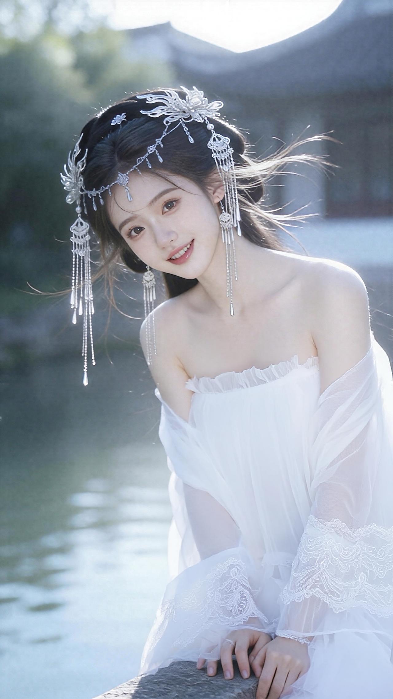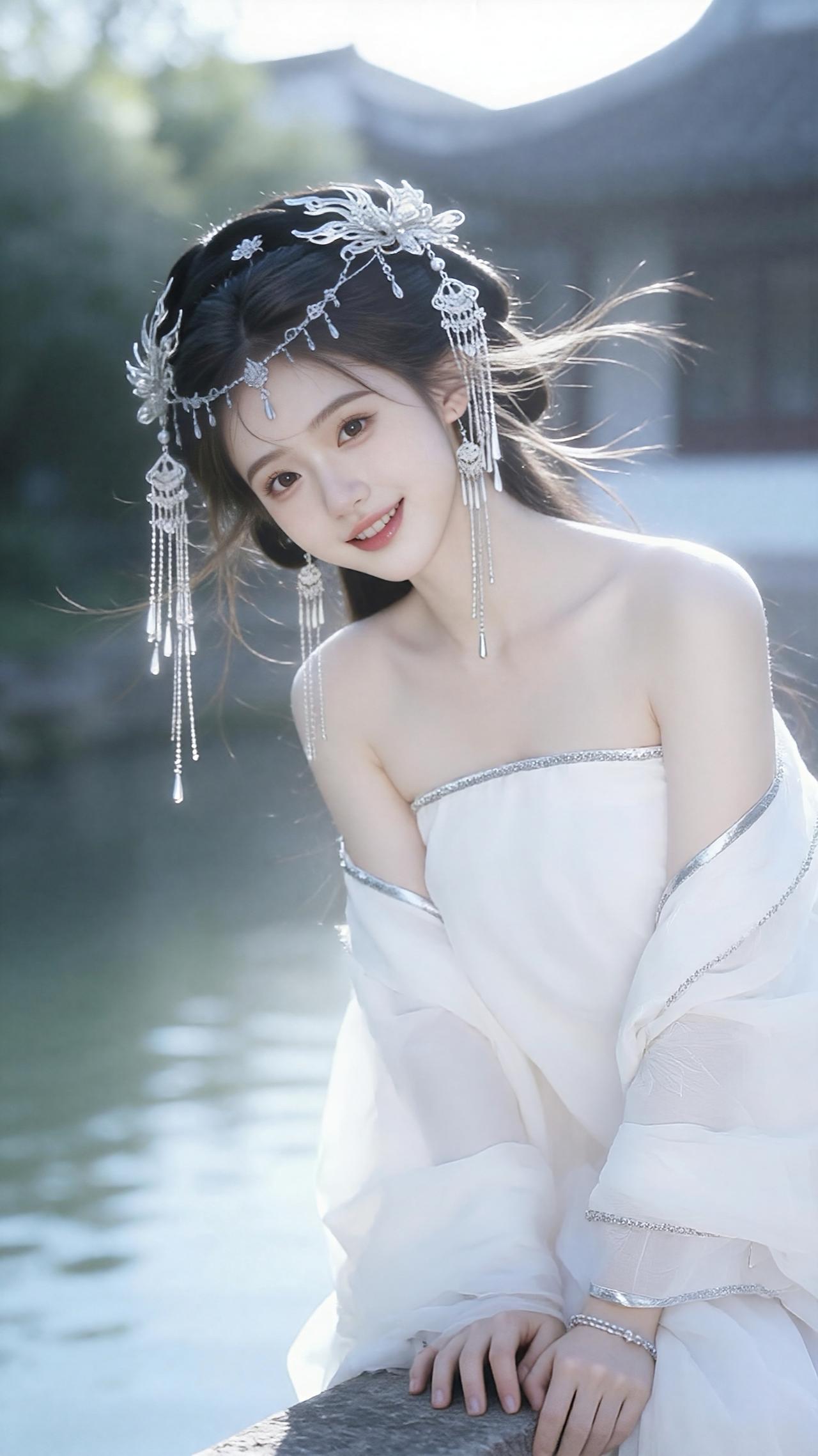 妆容发饰:少女眉眼清澈,笑容温婉动人。头戴银色水晶流苏发冠,精致的花型配饰搭配垂坠的流苏,随风轻扬,尽显灵动飘逸。