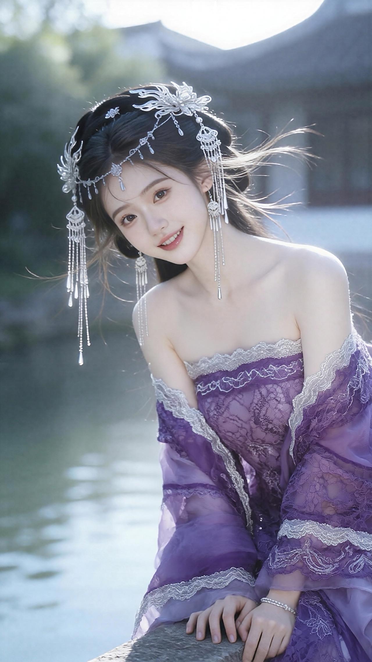 服饰风格:身着多款抹胸古风纱裙,以白色为主调,辅以紫色渐变。裙身采用轻盈的薄纱与精致蕾丝,露肩设计勾勒出优美肩线,裙摆层叠飘逸,仙气十足。