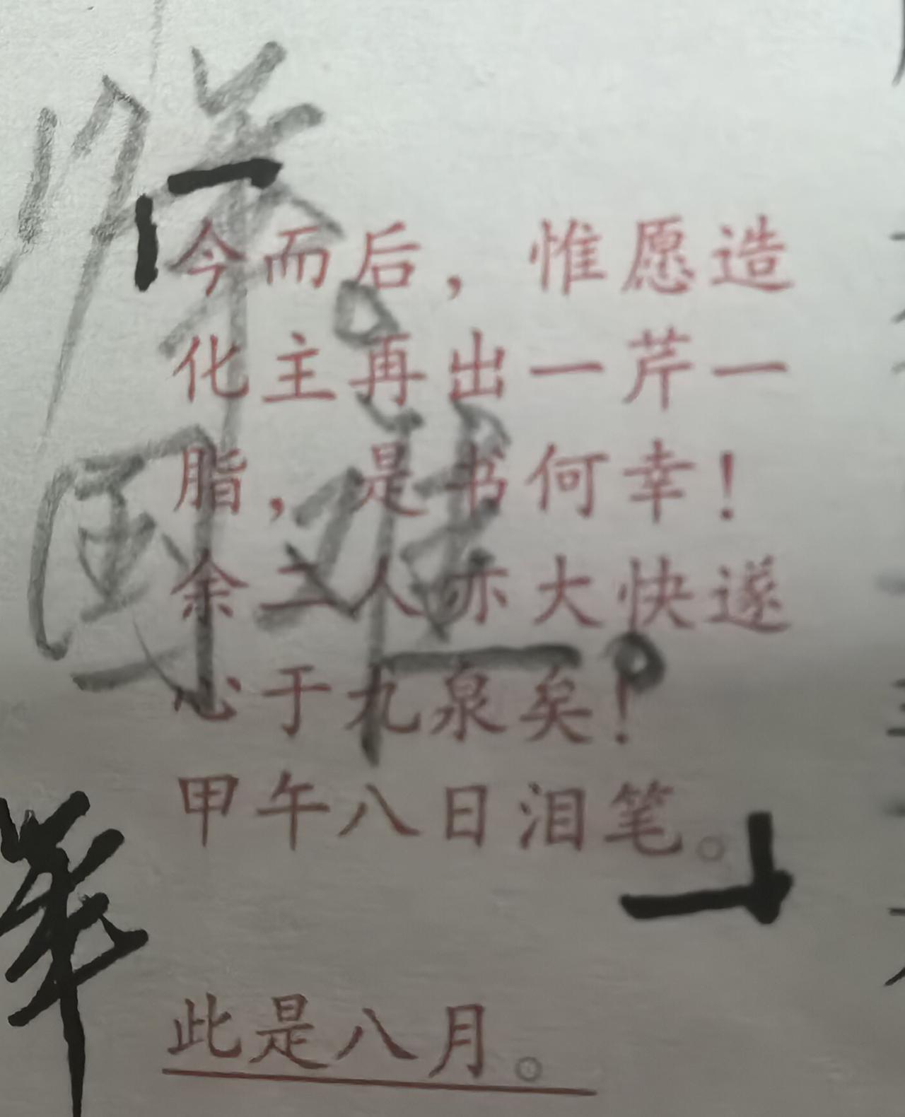 2.脂砚斋十分怀念曹雪芹。图二是脂砚斋侧批的另一截图。曹雪芹没有完成全部《红楼梦》,只写完前80回。雪琴死后已无任何人可以继续完成小说的创作工作,为后人留下了巨大的遗憾。每想到此,脂砚斋都希望造物主再造一个曹雪芹,再造一个脂砚斋,以便为这部影响世界的鸿篇巨著画上圆满的句号。