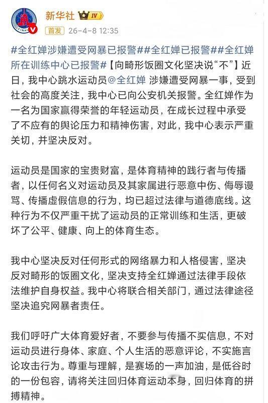 网络从来不是法外之地,躲在屏幕后面施暴的人,别以为删记录解散群就能逃掉。我们想看的是婵妹在跳台上闪闪发光,不是被畸形饭圈和恶意网暴裹挟。全力支持全红婵维权到底,愿所有运动员都能被尊重,只被赛场的聚光灯照亮!