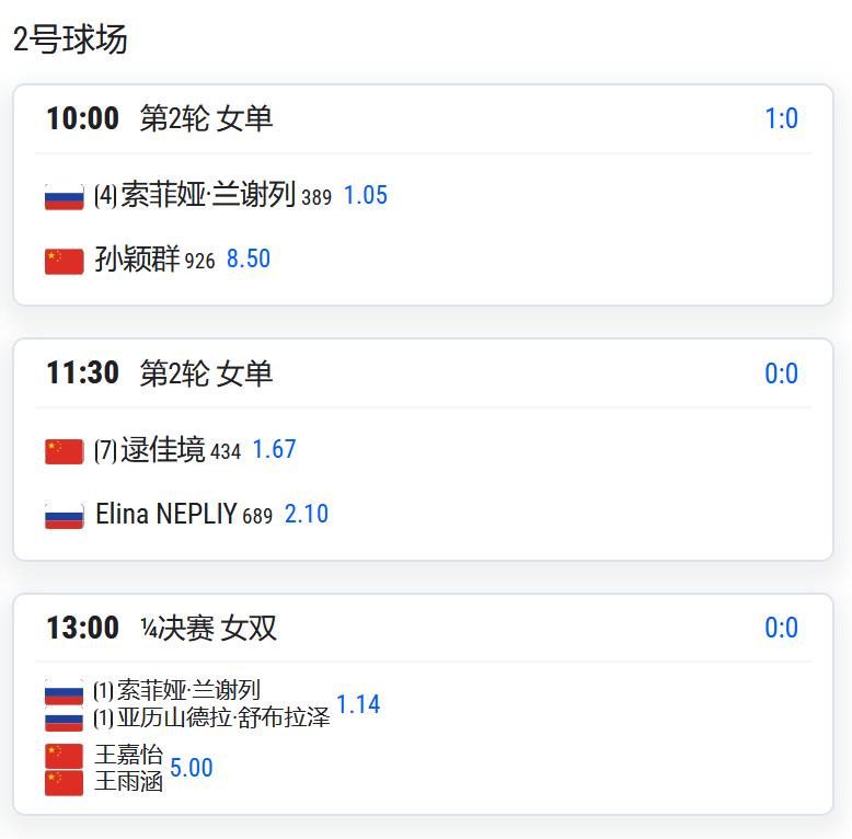 王嘉怡/王雨涵将对阵头号种子兰谢列/舒布拉泽。